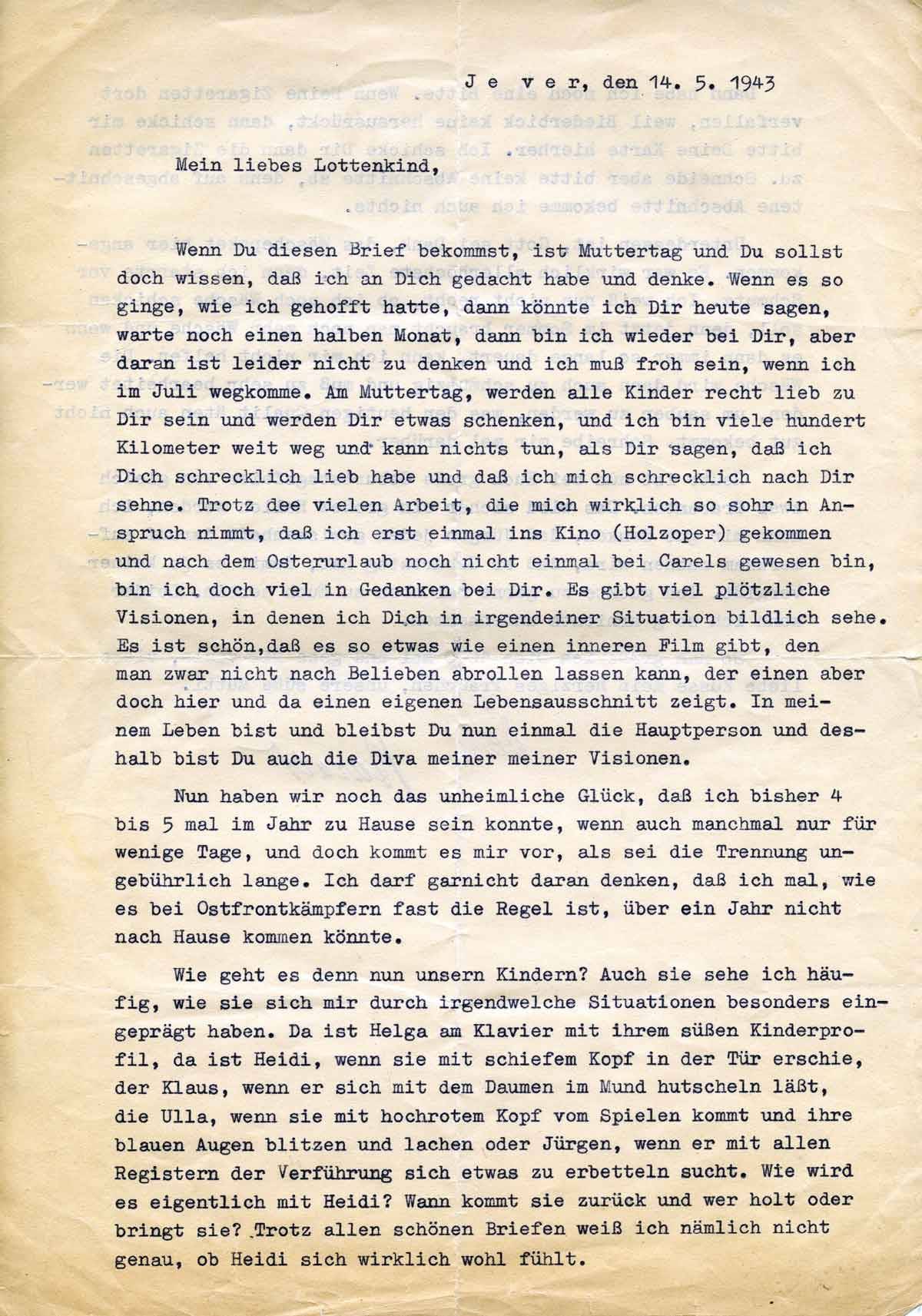 Wenn Du diesen Brief bekommst, ist Muttertag und Du solltest doch wissen dass ich an Dich gedacht habe und denke. Wenn es so ginge, wie ich gehofft hatte,, dann könnte ich Dir heute sagen, was noch einen halben Monat, dann bin ich wieder bei Dir, aber daran ist leider nicht zu denken und ich muss froh sein, wenn ich im Juli wegkomme am Muttertag, werden alle Kinder recht lieb zu Dir sein und werden Dir etwas schenken und ich bin viele hundert Kilometer weit weg und kann nichts tun, als Dir sagen das ich Dich schrecklich lieb habe und dass ich mich schrecklich nach Dir sehne. Trotz der vielen Arbeit, die mich wirklich so sehr in Anspruch nimmt, der sich erst einmal ins Kino (Holzoper) gekommen und nach dem Osterurlaub noch nicht einmal bei Carels gewesen bin, bin ich doch viel in Gedanken bei Dir. Es gibt viel plötzliche Visionen, in denen ich Dich in irgendeiner Situation bildlich sehe. Es ist schön, dass es so etwas wie einen inneren Film gibt, den man zwar nicht nach Belieben abrollen lassen kann, der ein aber doch hier und da einen eigenen Lebensausschnitt zeigt. In meinem Leben bist und bleibst Du nun einmal die Hauptperson und deshalb bist Du auch die Diva meiner Visionen.