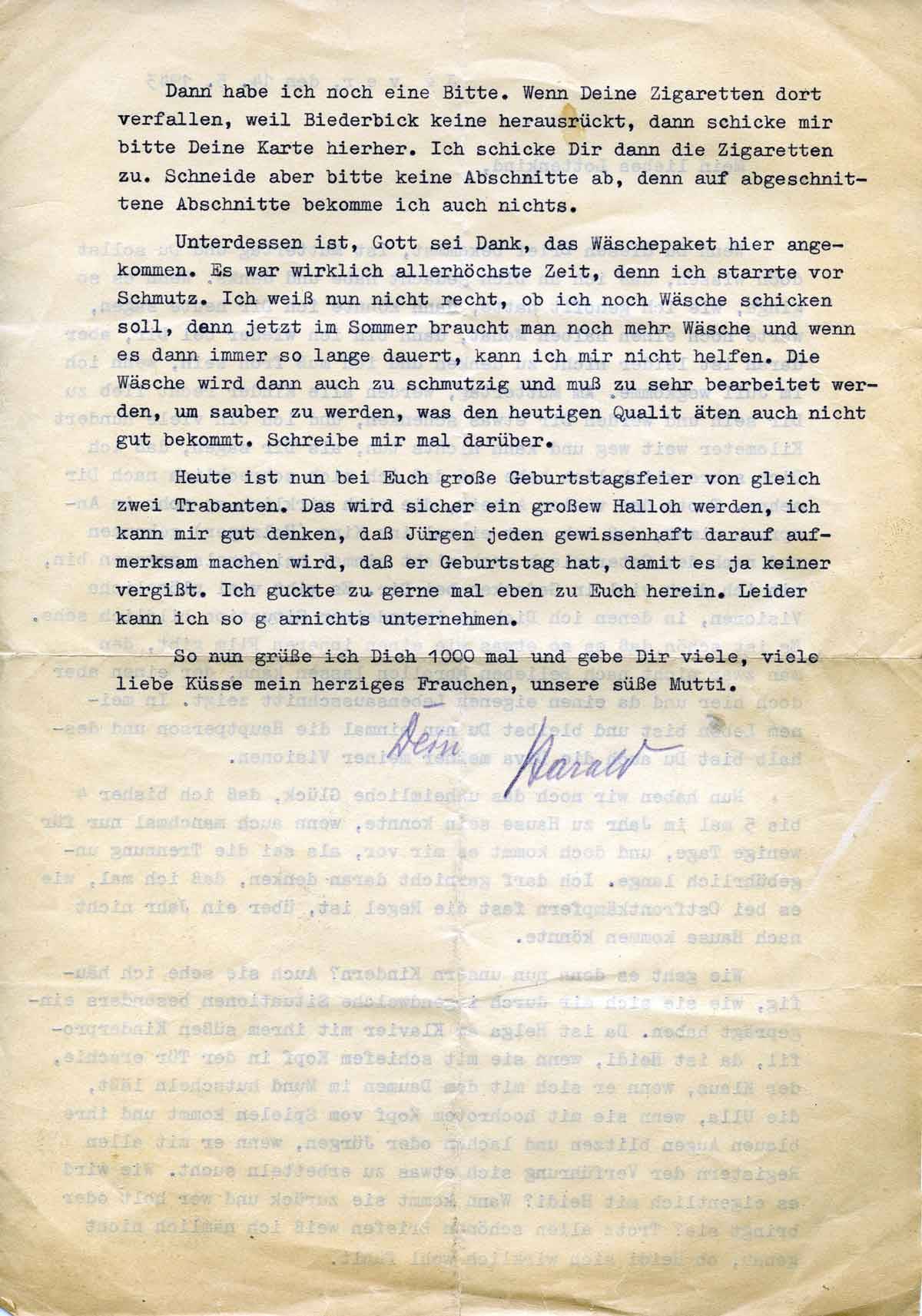Nun haben wir noch das unheimliche Glück, dass ich bisher 4 bis 5 mal im Jahr zu Hause sein konnte, wenn auch manchmal nur für wenige Tage (Anm. :wegen der geschäftlich bedingten Sonderurlaube) , und doch kommt es mir vor, als sei die Trennung ungebührlich lange. Ich darf gar nicht daran denken, daß ich mal, wie es bei Ostfrontkämpfern fast die Regel ist, über ein Jahr nicht nach Hause kommen könnte.