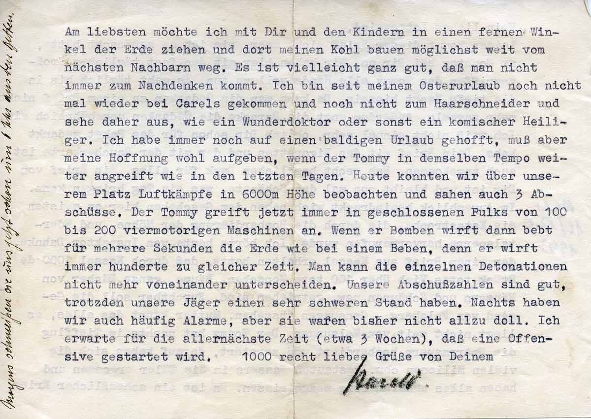 Am liebsten möchte ich mit Dir und den Kindern in einem fernen Winkel der Erde ziehen und dort mein Kohl bauen möglichst weit vom nächsten Nachbarn weg. Es ist vielleicht ganz gut, daß man nicht immer zum Nachdenken kommt. Ich bin seit meinem Osterurlaub noch nicht mal wieder bei Carels gekommen und noch nicht zum Haarschneider und sehe daher aus, wie ein Wunderdoktor oder sonst ein komischer Heiliger. Ich habe immer noch auf einen baldigen Urlaub gehofft, muss aber meine Hoffnung wohl aufgeben, wenn der Tommy in demselben Tempo weiter angreift wie in den letzten Tagen. Heute konnten wir über unseren Platz Luftkämpfe in 6000 m Höhe beobachten und sagen auch 3 Abschüsse. Der Tommy greift jetzt immer in geschlossenen Pulks von 100-200 viermotorigen Maschinen an. Wenn er Bomben wirft dann webt für mehrere Sekunden die Erde wie bei einem Beben, denn er wirft immer Hunderte zu gleicher Zeit. Man kann die einzelnen Detonationen nicht mehr voneinander unterscheiden. Unsere Abschusszahlen sind gut, trotzdem unsere Jäger einen sehr schweren Stand haben. Nachts haben wir auch häufig Alarme, aber sie waren bisher nicht allzu doll. Ich erwarte für die allernächste Zeit (etwa 3 Wochen), dass eine Offensive gestartet wird.