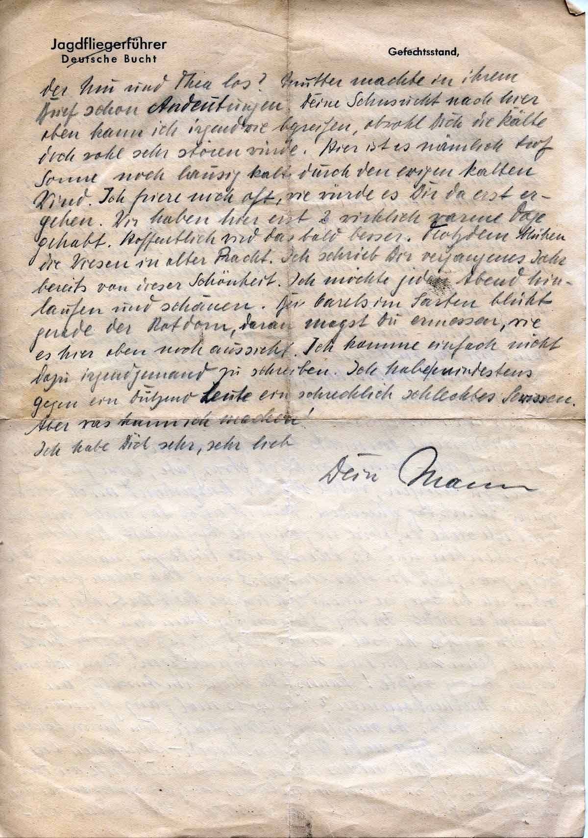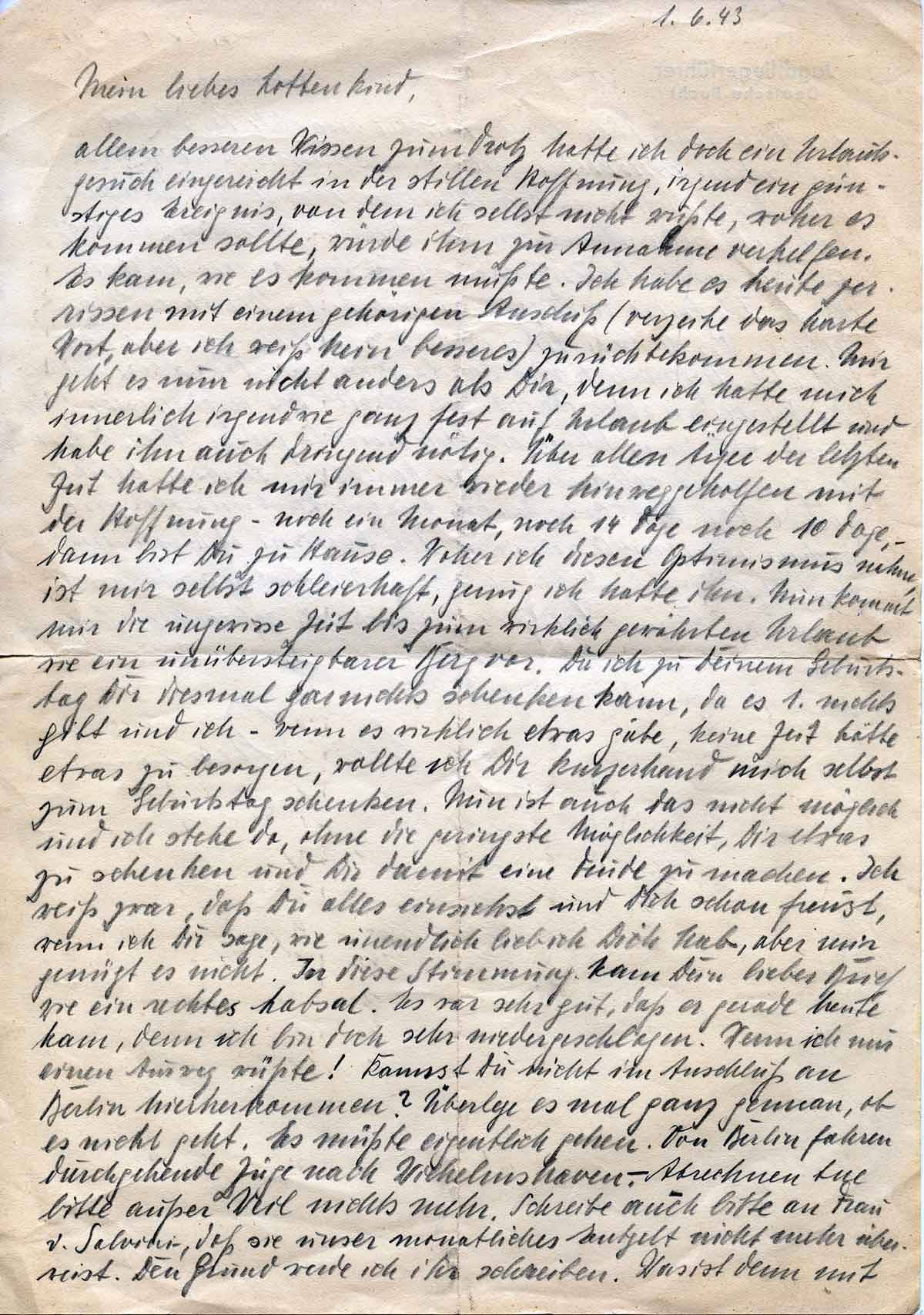 allem besseren Wissen zum Trotz hatte ich doch ein Urlaubsgesuch eingereicht in der stillen Hoffnung, irgend ein günstiges Ereignis, von dem ich selbst nicht wusste, woher es kommen sollte, würde ihn zur Annahme verhelfen. Es kam, wie es kommen musste. Ich habe es heute zerrissen mit einem gehörigen Anschiß (verzeihe das harte Wort, aber ich weiß kein besseres) zurückbekommen. Mir geht es nun nicht anders als Dir, denn ich hatte mich innerlich irgendwie ganz fest auf Urlaub eingestellt und habe ihn auch dringend nötig. Über allen Ärger der letzten Zeit hatte ich mir immer wieder hinweggeholfen mit der Hoffnung – noch einen Monat, noch 14 Tage noch 10 Tage, – dann bist Du zu Hause. Woher ich diesen Optimismus nehme, ist mir selbst schleierhaft, genug ich hatte ihn. Nun kommt mir die ungewisse Zeit bis zum wirklich gewährten Urlaub wie ein unübersteigbarer Berg vor. Da ich zu Deinem Geburtstag Dir diesmal gar nichts schenken kann, da es 1. nichts gibt und ich – wenn es wirklich etwas gäbe, keine Zeit hatte etwas zu besorgen, wollte ich Dir kurzerhand mich selbst zum Geburtstag schenken. Nun ist auch das nicht möglich und ich stehe da, ohne die geringste Möglichkeit, dir etwas zu schenken und Dir damit eine Freude zu machen. Ich weiß zwar, dass Du alles einsiehst und Dich schon freust, wenn ich Dir sage, wie unendlich lieb ich Dich hab, aber mir genügt es nicht. In diese Stimmung kam Dein lieber Brief wie ein rechtes Labsal. Es war sehr gut, dass es gerade heute kam, denn ich bin doch sehr niedergeschlagen. Wenn ich nur einen Ausweg wüsste! Kannst Du nicht im Anschluss an Berlin hierher kommen? Überlege es mal ganz genau, ob es nicht geht. Es müsste eigentlich gehen. Von Berlin fahren durchgehende Züge nach Wilhelmshaven. – Abrechnen (unleserlich) bitte außer Wiel nichts mehr. Schreibe auch bitte an Frau v. Salvini, dass sie unser monatliches Entgelt nicht mehr überweist. Den Grund werde ich ihr schreiben. Was ist denn mit