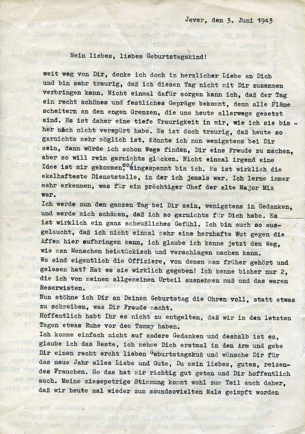 Weit weg von Dir denke ich doch in herzlicher Liebe an Dich und bin sehr traurig, dass ich diesen Tag nicht mit Dir zusammen verbringen kann. Nicht einmal dafür sorgen kann ich, dass der Tag ein recht schönes und festliches Gepräge bekommt, denn alle Pläne scheitern an den engen Grenzen, die uns heute allerwege gesetzt sind. Es ist daher eine tiefe Traurigkeit in mir, wie ich sie bisher noch nicht verspürt habe. Es ist doch traurig, dass heute so garnichts mehr möglich ist. Könnte ich nun wenigstens bei Dir sein, dann würde ich schon Wege finden, Dir eine Freude zu machen, aber so will rein garnichts glücken. Nicht einmal irgend eine Idee ist mir gekommen, so eingespannt bin ich. Es ist wirklich die ekelhafteste Dienststelle, in der ich jemals war. Ich lerne immer mehr erkennen, was für ein prächtiger Chef der alte Major Mix war.