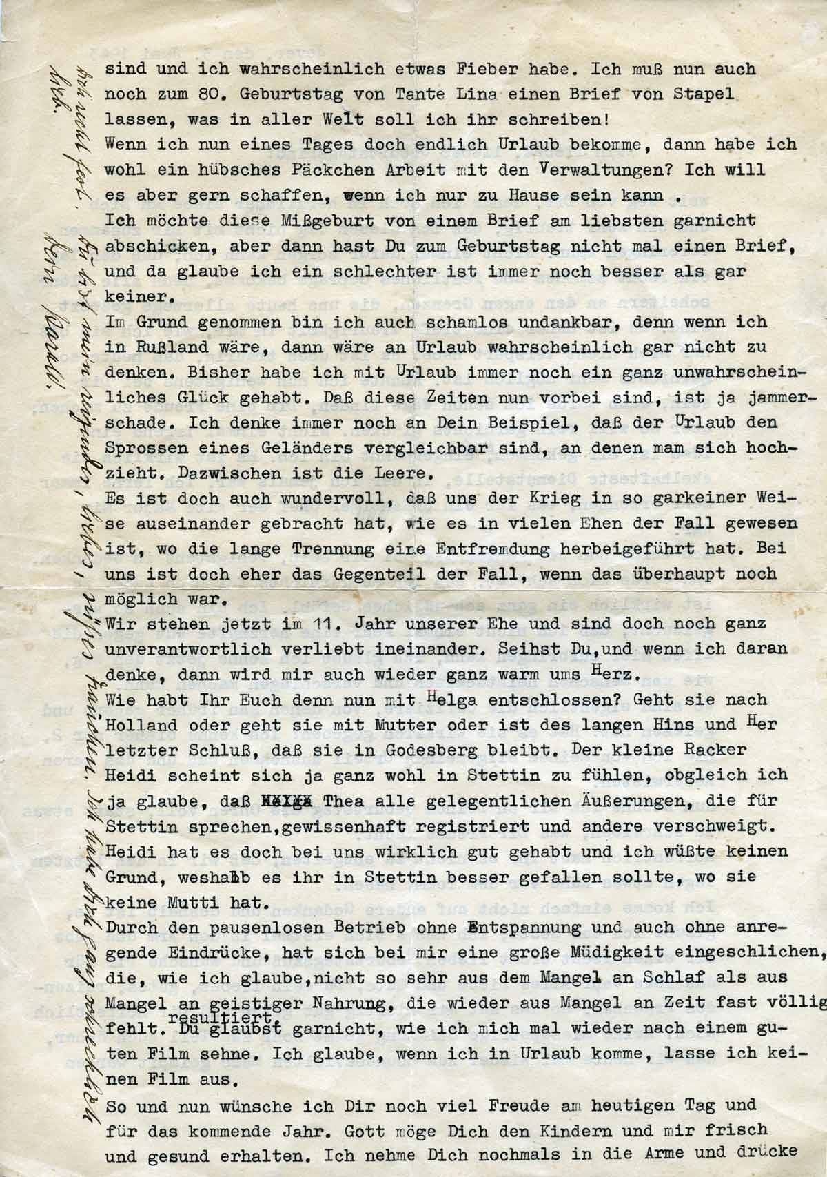 Wie habt Ihr Euch denn nun mit Helga entschlossen? Geht sie nach Holland oder geht sie mit Mutter oder ist des langen Hins und Her letzter Schluss, dass sie in Godesberg bleibt. Der kleine Racker Heidi scheint sich ja ganz wohl in Stettin zu fühlen, obgleich ich ja glaube, dass Thea alle gelegentlichen Äußerungen, die für Stettin sprechen, gewissenhaft registriert und andere verschweigt. Heidi hat es doch bei uns wirklich gut gehabt und ich wüsste keinen Grund, weshalb es ihr in Stettin besser gefallen sollte, wo sie keine Mutti hat.