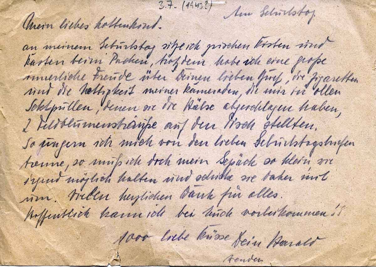 an meinem Geburtstag sitze ich zwischen Kisten und Kästen beim Packen, trotzdem habe ich eine große innerliche Freude über Deinen letzten Brief, die Zigaretten und die Nettigkeit meiner Kameraden, die mir in ollen Sektpullen, denen sie die Hälse abgeschlagen haben, 2 Feldblumensträuße auf den Tisch stellten.