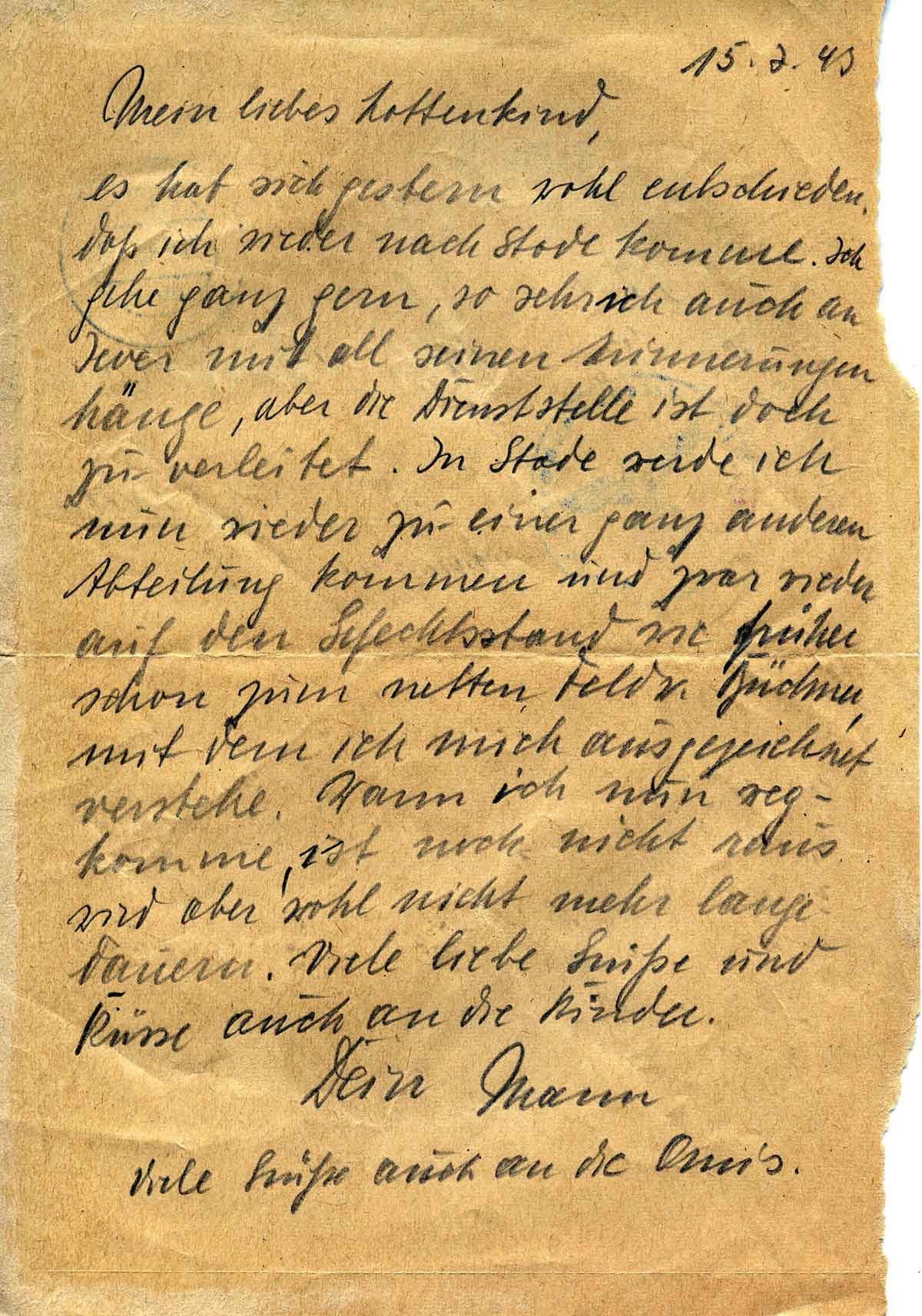 Es hat sich gestern wohl entschieden, dass ich wieder nach Stade komme. Ich gehe ganz gern, so sehr ich auch ein Jever mit all seinen Erinnerungen hänge, aber die Dienststelle ist jedoch zu verleidet. In Stade werde ich nun wieder zu einer ganz anderen Abteilung kommen und zwar wieder auf den Gefechtsstand wie früher schon zum netten Feldw. Büchner, mit dem ich mich ausgezeichnet verstehe. Wann ich nun wegkomme, ist noch nicht raus wird aber wohl nicht mehr lange dauern.