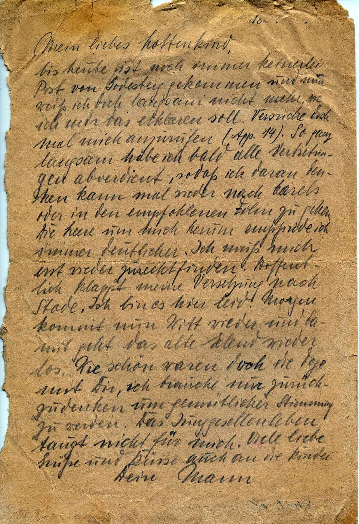 Bis heute ist noch immer keinerlei Post von Godesberg gekommen und nun weiß ich doch langsam nicht mehr, wie ich mir das erklären soll. Versuche doch mal mich anzurufen (App. 14). So ganz langsam habe ich bald alle Vertretungen abverdient, sodass ich daran denken kann, mal wieder nach Carels oder in den empfohlenen Film zu gehen. Die Leere um mich herum empfinde ich immer deutlicher. Ich muss mich erst wieder zurechtfinden. Hoffentlich klappt meine Versetzung nach Stade. Ich bin es ja leid! Morgen kommt nun Witt wieder und damit geht das alte Elend wieder los. Wie schön waren doch die Tage mit Dir, ich brauche nur zurückzudenken um gemütlicher Stimmung zu werden. Das Junggesellenleben taugt nicht für mich.