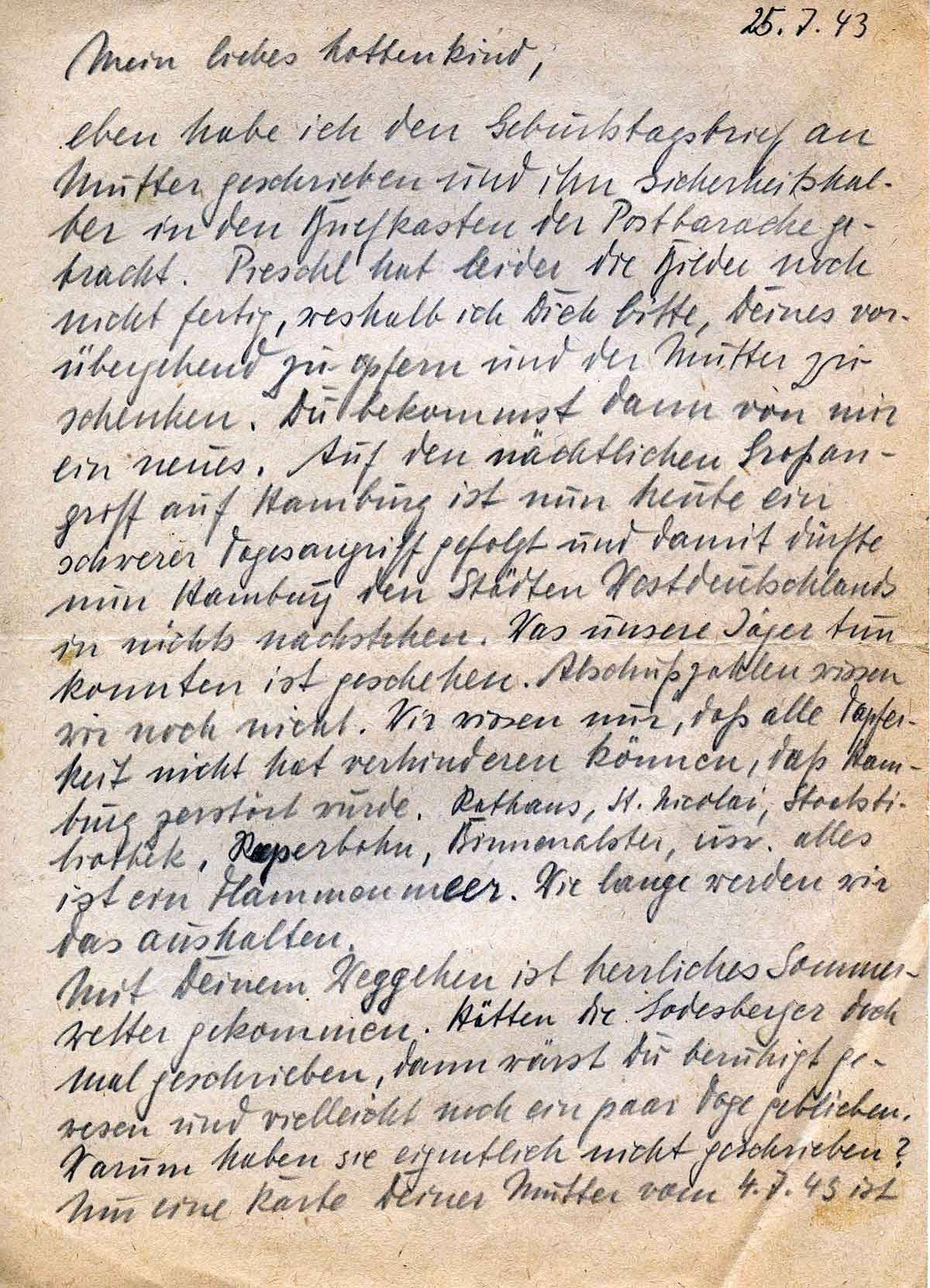 Eben habe ich den Geburtstagsbrief an Mutter geschrieben und ihn sicherheitshalber in den Briefkasten der Postbaracke gebracht. Preschl hat leider die Bilder noch nicht fertig, weshalb ich Dich bitte Deines vorübergehend zu opfern und der Mutter zu schenken. Du bekommst dann von mir ein neues. Auf den nächtlichen Großangriff auf Hamburg ist nun heute ein schwerer Tagesangriff gefolgt und damit dürfte nun Hamburg den Städten Westdeutschlands in nichts nachstehen. Was unsere Jäger tun konnten ist geschehen. Abschusszahlen wissen wir noch nicht. Wir wissen nur, dass alle Tapferkeit nicht hat verhindern können, dass Hamburg zerstört wurde. Rathaus, Sankt Nicolai, Stadtbibliothek, Reeperbahn, Binnenalster usw. Alles ist ein Flammenmeer. Wie lange werden wir das aushalten.