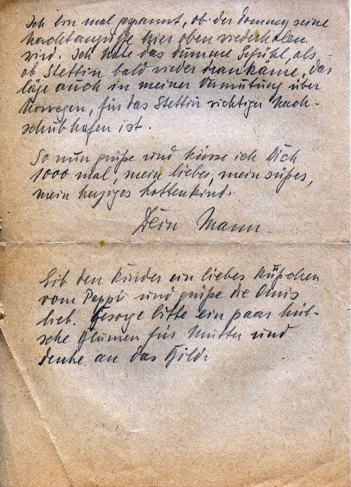 Gib den Kindern ein liebes Küsschen vom Papi und grüße die Omis lieb. Besorge bitte ein paar hübsche Blumen für Mutter und denke an das Bild.