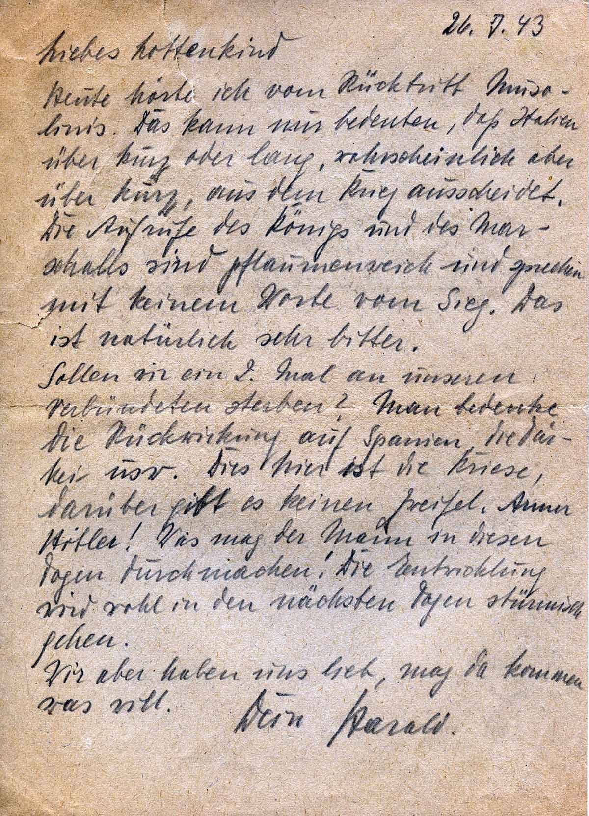 heute hörte ich vom Rücktritt Musolinis . Das kann nur bedeuten, dass Italien über kurz oder lang, wahrscheinlich aber über kurz, aus dem Krieg ausscheidet. Die Aufrufe des Königs und des Marschalls sind pflaumenweich und sprechen mit keinem Worte vom Sieg. Das ist natürlich sehr bitter.