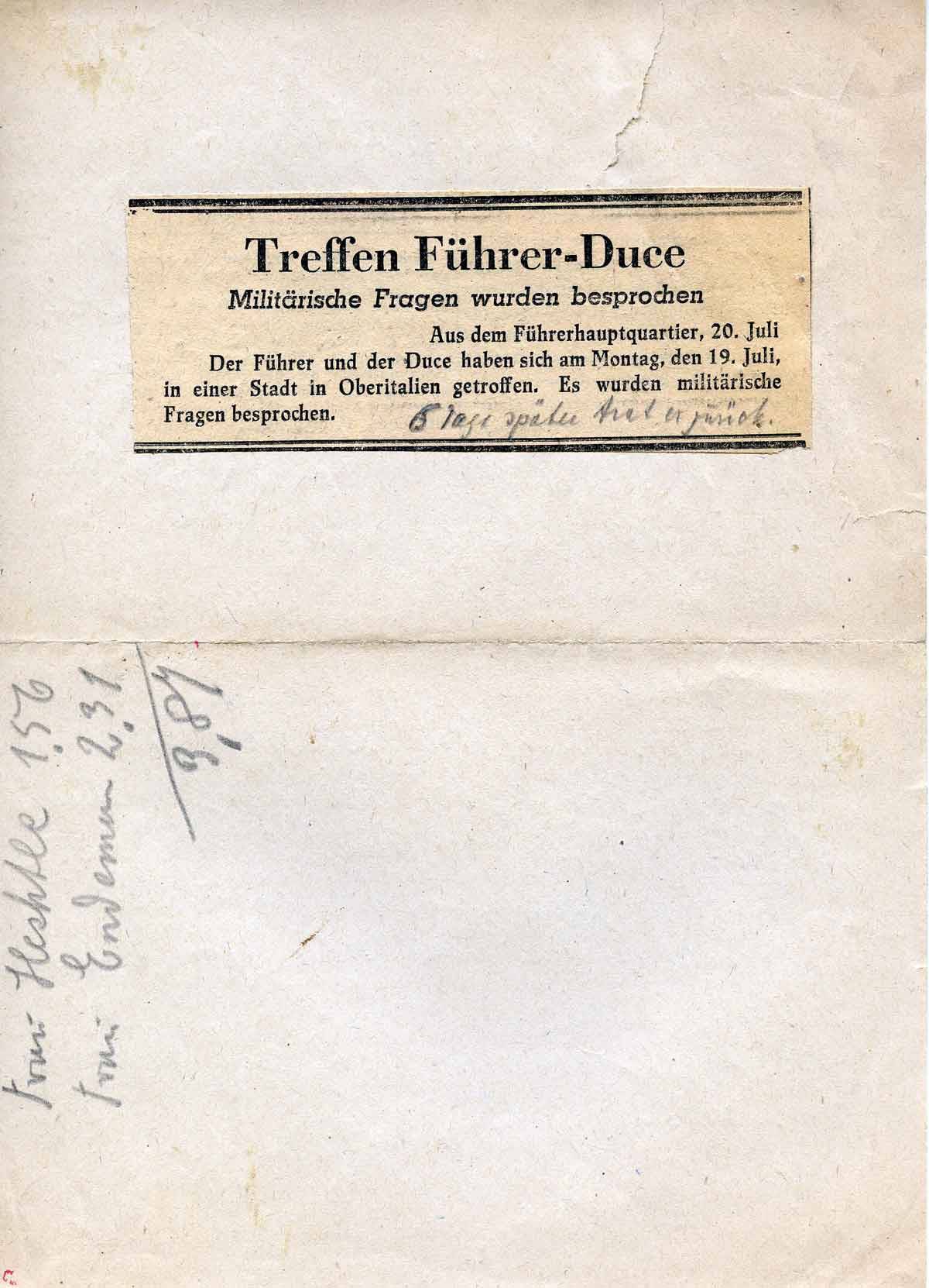der Führer und der Duce haben sich am Montag, dem 19. Juli, in einer Stadt in Oberitalien getroffen. Es wurden militärische Fragen besprochen.