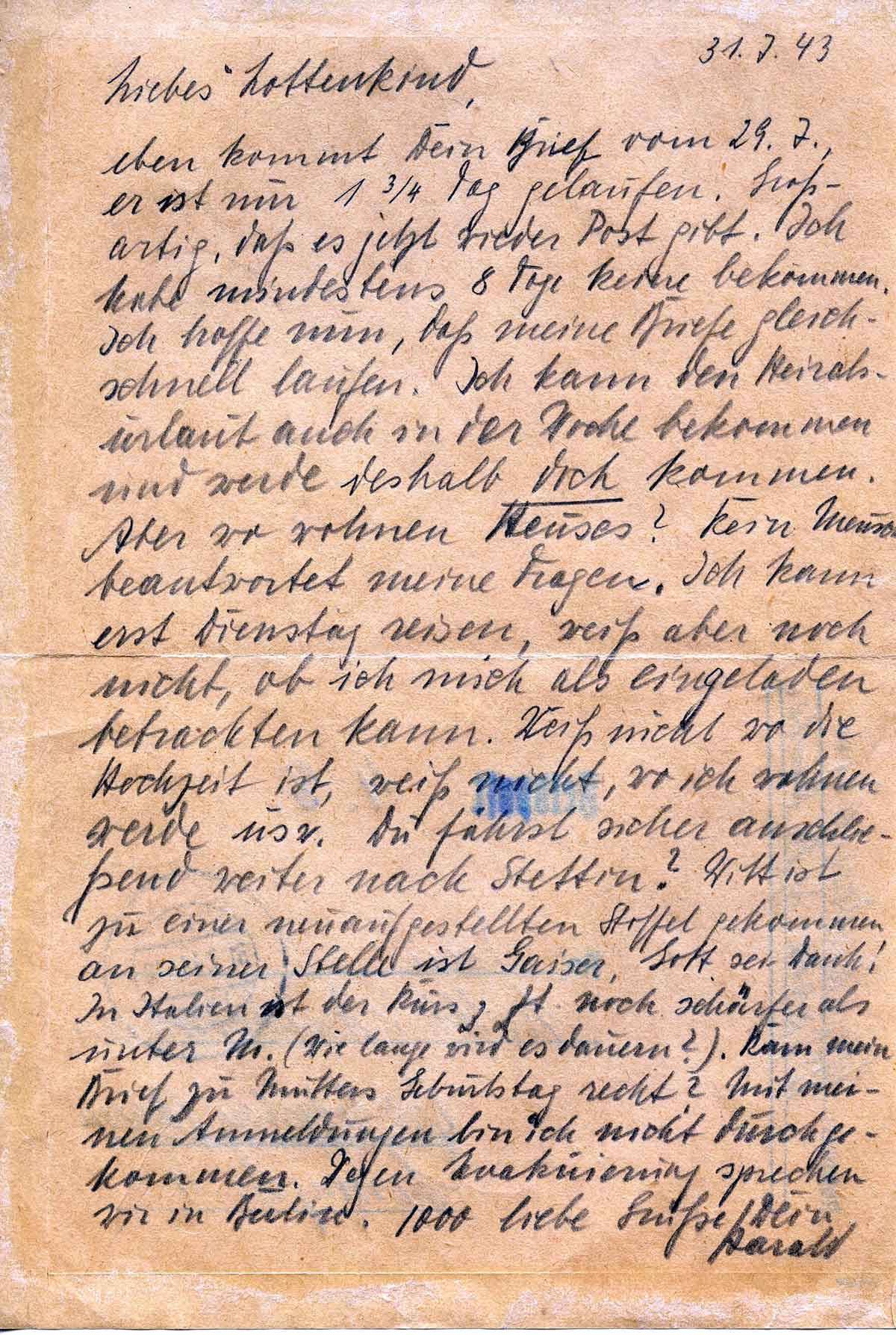 eben kommt Dein Brief vom 29. Juli. Er ist nur 1 ¾ Tag gelaufen. Großartig, dass es jetzt wieder Post gibt. Ich habe mindestens 8 Tage keine bekommen. Ich hoffe nun, dass meine Briefe gleich schnell laufen. Ich kann den Heiratsurlaub (zur Hochzeit von Lottis Schwester) auch in der Woche bekommen und werde deshalb doch kommen. Aber wo wohnen Heuses? Kein Mensch beantwortet meine Fragen. Ich kann erst Dienstag reisen, weiß aber noch nicht, ob ich mich als einen geladen betrachten kann. Weiß nicht wo die Hochzeit ist, weiß nicht, wo ich wohnen werde usw. Du fährst sicher anschließend weiter nach Stettin? Witt ist zu einer neuaufgestellten Staffel gekommen , an seiner Stelle ist Gaiser. Gott sei Dank! In Italien ist der Kurs z.Zt. noch schärfer als unter M. (Wie lange wird es dauern?). Kam mein Brief zu Mutters Geburtstag recht? Mit meinen Anmeldungen bin ich nicht durchgekommen. Wegen Evakuierung sprechen wir in Berlin.