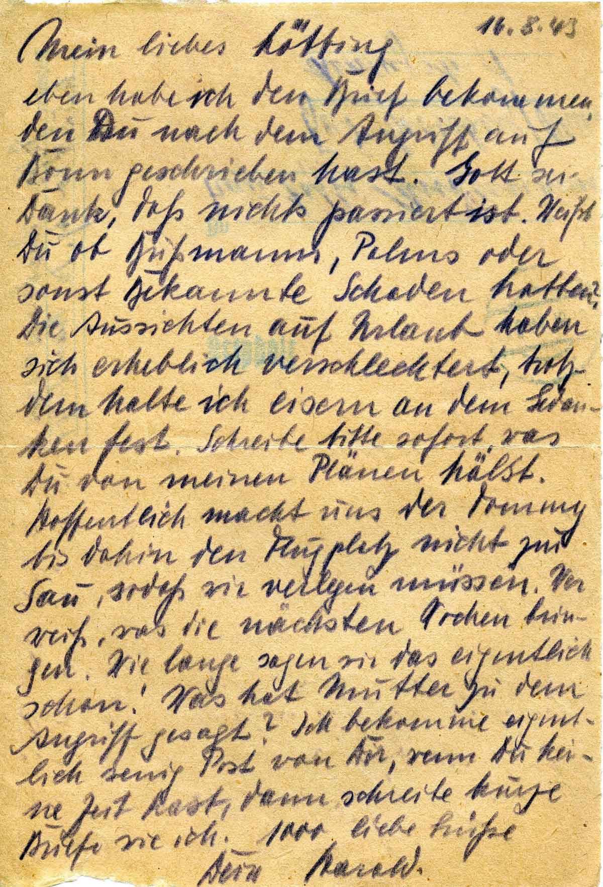 Hoffentlich macht uns der Tommy bis dahin den Flugplatz nicht zur Sau, so das wir verlegen müssen. Wer weiß, was die nächsten Wochen bringen. Wie lange sagen wir das eigentlich schon! Was hat Mutter zu dem Angriff gesagt? Ich bekomme eigentlich wenig Post von Dir wenn Du keine Zeit hast, dann schreibe kurze Briefe wie ich.