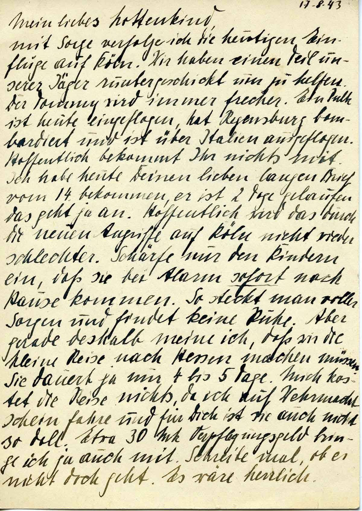 mit Sorge verfolge ich die heutigen ein Flüge auf Köln. Wir haben ein Teil unserer Jäger runter geschickt um zu helfen. Der Tommy wird immer frecher. Ein Pulk ist heute eingeflogen, hat Regensburg bombardiert und ist über Italien ausgeflogen. Hoffentlich bekommt Ihr nichts mit. Ich habe heute Deinen lieben langen Brief vom 14. bekommen, er ist 2 Tage gelaufen, das geht ja an. Hoffentlich wird das durch die neuen Angriffe auf Köln nicht wieder schlechter. Schärfe nur den Kindern ein, dass sie bei Alarm sofort nach Hause kommen. So steckt man voller Sorgen und findet keine Ruhe. Aber gerade deshalb meine ich, dass wir die kleine Reise nach Hessen machen müssen. Sie dauert ja nur 4-5 Tage. Mich kostet die Reise nichts, da ich auf Wehrmacht Schein fahre und für Dich ist sie auch nicht so doll. Etwa 30 Mk Verpflegung Geld bringe ich ja auch mit. Schreibe mal, ob es nicht doch geht. Es wäre herrlich.