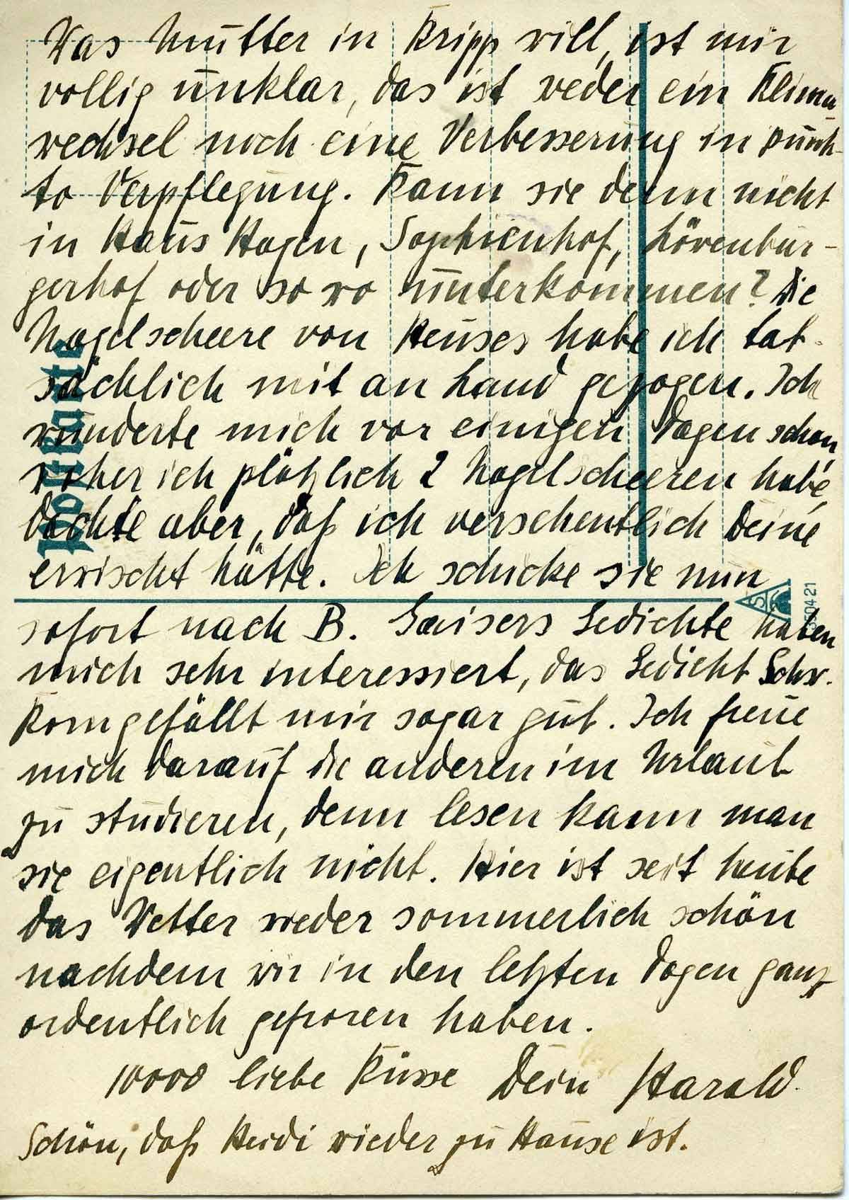 Was Mutter in Kripp will, ist mir völlig unklar, das ist weder ein Klimawechsel noch eine Verbesserung in punkto Verpflegung. Kann sie denn nicht in Haus Hagen, Sophienhof, Löwenenburger Hof oder so wo unterkommen? Die Nagelschere von Heuses habe ich tatsächlich mit an Land gezogen. Ich wunderte mich vor einigen Tagen schon, woher ich plötzlich 2 Nagelscheren habe, dachte aber, dass ich versehentlich Deine erwischt hätte. Ich schicke sie nun sofort nach B(erlin). Gaisers Gedichte haben mich sehr interessiert, das Gedicht Schw. Korn gefällt mir sogar gut. Ich freue mich darauf die anderen im Urlaub zu studieren, denn lesen kann man sie eigentlich nicht. Hier ist seit heute das Wetter wieder sommerlich schön nachdem wir in den letzten Tagen ganz ordentlich gefroren haben.