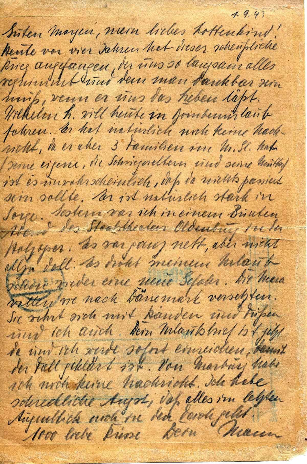 Heute vor vier Jahren hat dieser scheußliche Krieg angefangen, der uns so langsam alles wegnimmt und dem man dankbar sein muss, wenn er uns das Leben lässt. Wilhelm L. will heute in Bombenurlaub fahren. Er hat natürlich noch keine Nachricht, wo er aber 3 Familien im M. Gl.. Hat (seine eigene, die Schwiegereltern und seine Mutter) ist es unwahrscheinlich, dass da nichts passiert sein sollte. Er ist natürlich stark in Sorge. Gestern war ich in einem großen bunten Abend des Staatstheaters Oldenburg in der Holzoper. Es war ganz nett, aber nicht allzu doll. Es droht meinem Urlaub schon wieder eine neue Gefahr. Die Mara wollen sie nach Dänemark versetzen. Sie wehrt sich mit Händen und Füßen und ich auch. Dein Urlaubsbrief ist jetzt da und ich werde sofort einreichen, damit der Fall geklärt ist. Von Marburg habe ich noch keine Nachricht. Ich habe schreckliche Angst, dass alles im letzten Augenblick noch in den Teich geht.