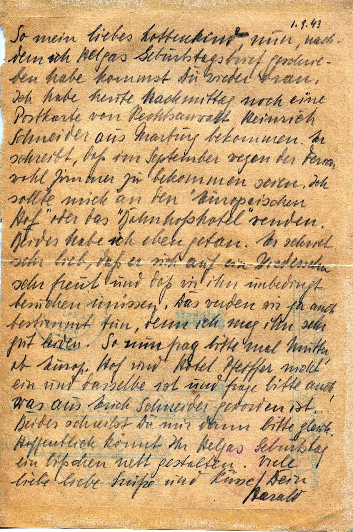 nun, nachdem ich Helgas Geburtstagsbrief geschrieben habe kommst Du wieder dran. Ich habe heute Nachmittag noch eine Postkarte von Rechtsanwalt Heinrich Schneider aus Marburg bekommen. Er schreibt, dass im September wegen der Ferien wohl Zimmer zu bekommen seien. Ich sollte mich an den „Europäischen Hof“ oder das „Bahnhofshotel“ wenden. Beides habe ich eben getan. Er schrieb sehr lieb, dass er sich auf ein Wiedersehen sehr freut und das wir Ihnen unbedingt besuchen müssen, das werden wir ja auch bestimmt tun, denn ich mag ihn sehr gut leiden. So nun frag bitte mal Mutter ob Europ. Hof und Hotel Pfeiffer nicht ein und dasselbe sind und frage bitte auch, was aus Erich Schneider geworden ist. Beides schreibst Du mir dann bitte gleich. Hoffentlich könnt Ihr Helgas Geburtstag ein bisschen nett gestalten.