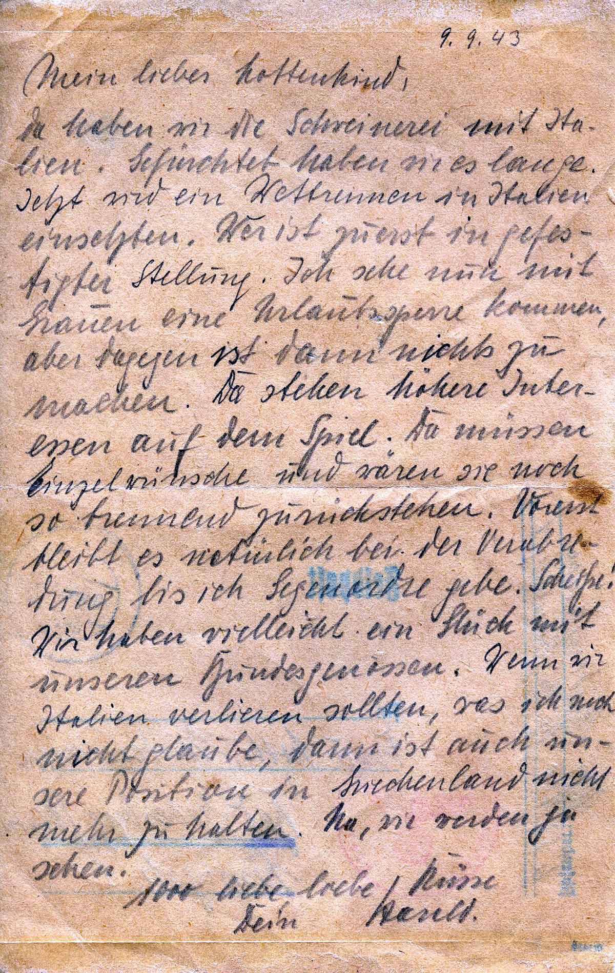 Da haben wir die Schweinerei mit Italien. Gefürchtet haben wir es lange. Jetzt wird ein Wettrennen in Italien einsetz(t)en. Wer ist zuerst in gefestigter Stellung. Ich sehe nun mit Grauen eine Urlaubssperre kommen, aber dagegen ist da nichts zu machen. Da stehen höhere Interessen auf dem Spiel. Da müssen Einzelwünsche und wären sie noch so brennend zurückstehen. Vorerst bleibt es natürlich bei der Verabredung bis ich Gegenordre gebe. Scheiße! Wir haben vielleicht ein Glück mit unseren Bundesgenossen. Wenn wir in Italien verlieren sollten, was ich noch nicht glaube, dann ist auch unsere Position in Griechenland nicht mehr zu halten. Na, wir werden ja sehen.