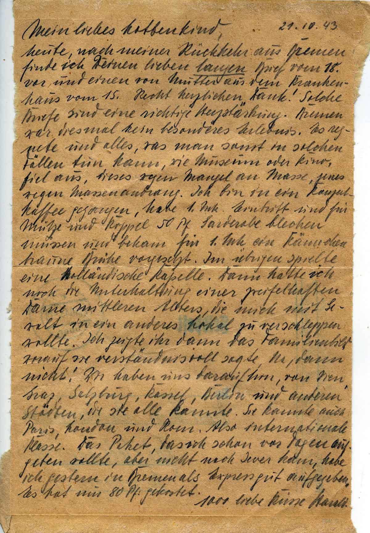 Heute, nach meiner Rückkehr aus Bremen finde ich Deinen lieben langen Brief vom 18. vor und einen von Mutter aus dem Krankenhaus vom 15.. Recht herzlichen Dank! Solche Briefe sind eine richtige Herzstärkung. Bremen war diesmal kein besonderes Erlebnis. Es regnete und alles, was man sonst in solchen Fällen tun kann, wie Museum oder Kino, viel aus, dieses wegen Mangel an Masse, jenes wegen Massenandrang. Ich bin in ein Konzertkaffee gegangen, habe 1 Mk. Eintritt und für Mütze und Koppel 50 Pfennig Garderobe blechen müssen und bekam für 1 Mk. ein Kännchen braune Brühe vorgesetzt. Im übrigen spielte eine holländische Kapelle. Dann hatte ich noch die Unterhaltung einer zweifelhaften Dame mittleren Alters die nicht mit Gewalt in ein anderes Lokal /zu/verschleppen wollte. Ich zeigte ihr dann das Familienbild, worauf sie verständnisvoll sagte, na, dann nicht! Wir haben uns daraufhin von Wien, Graz, Salzburg, Kassel, Berlin und anderen Städten, die sie alle kannte (sc. erzählt). Sie kannte auch Paris, London und Rom. Also internationale Klasse. Das Paket, das ich schon vor Tagen aufgeben wollte, aber nicht nach Jever kam, habe ich gestern in Bremen als Expressgut aufgegeben. Es hat nur 80 Pf. Gekostet.