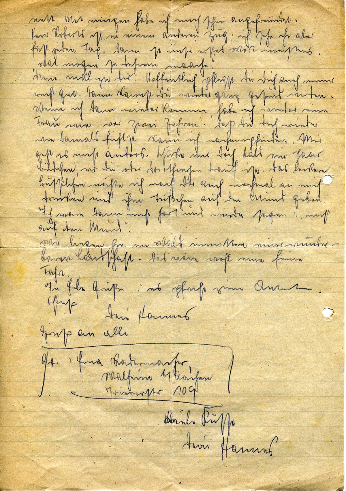 Gerade erhalte ich Dein erstes Lebenszeichen, die Briefkarte vom 4.9. Einen Brief, von dem Du schreibst, habe ich nicht bekommen. Vielleicht hast Du das L bei Ließem nicht deutlich geschrieben, denn die Briefkarte ist auch bei verschiedenen Kompanien herumgeflogen. Hier noch mal meine richtige Adresse:
