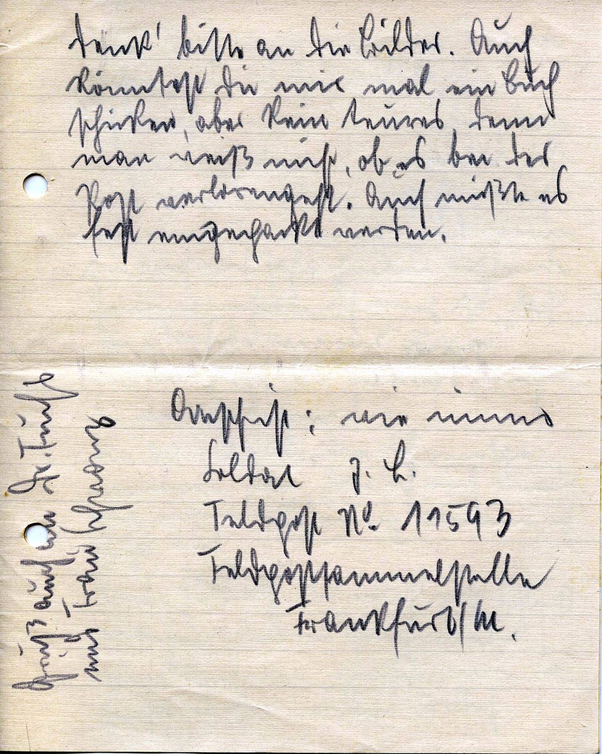 Also, schreibe mir bald wieder, da man jeden Tag, an dem Post verteilt wird, fiebrig auf einen Brief wartet und sich wie ein Waisenkind vorkommt, wenn man zum Schluß nicht dabei war.