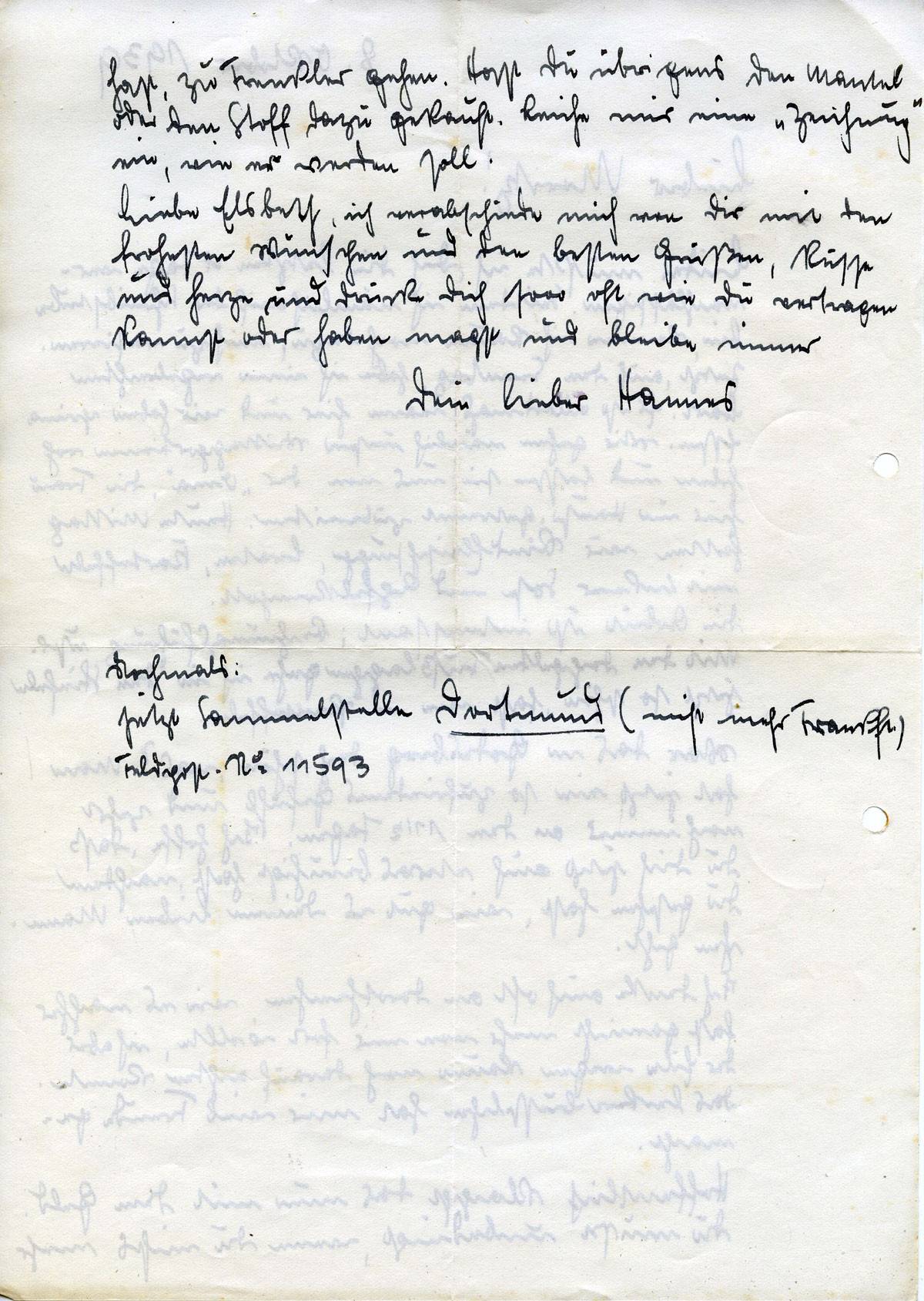Leider mußte ich Dich die letzten 4 Tage vernachlässigen. Seitdem ich nämlich auf der Schreibstube bin, komme ich kaum noch dazu, mich zu rasieren. Jetzt, auf den Sonntag, habe ich einen regelrechten Bart. Es ist allerdings warm hier und wir haben prima Essen. Wir gehen nämlich unsere Mittagportionen roh holen und lassen sie uns von der „Oma", die Frau hier im Hause, getrennt zubereiten. Heute Mittag hatten wir Rindfleischsuppe, Braten, Kartoffeln mit leckerer Soße und Apfelkompott.
