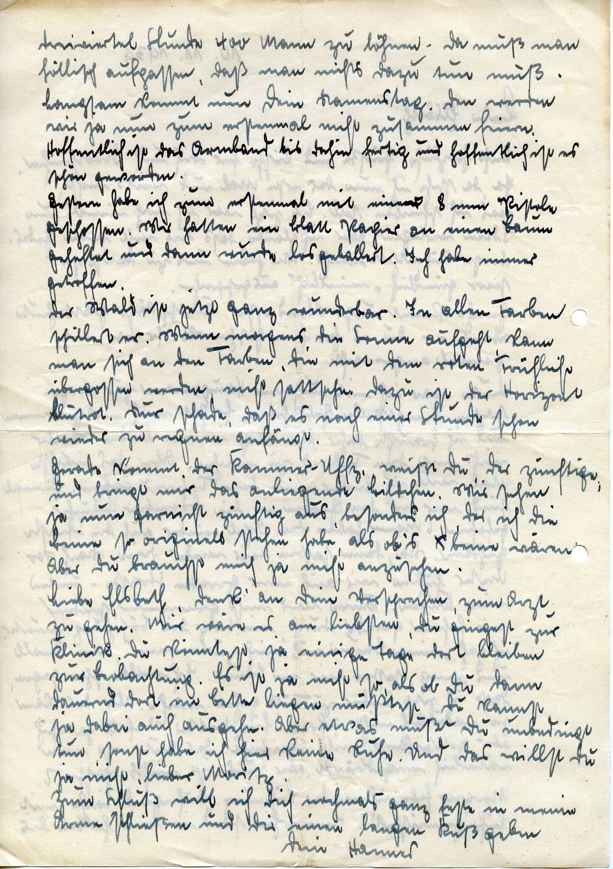 Recht herzliche Grüße und Küsse für Dich und Dorotheechen. Ja, da stehe ich nun das Erste Mal und weiß nicht, was ich schreiben soll. Bis jetzt war ich noch niemals um Ideen verlegen. Aber ich glaube, daß dies wohl mein Godesberger Aufenthalt macht. Wir haben uns zu Hause ja soooo gründlich „mündlich" ausgesprochen.