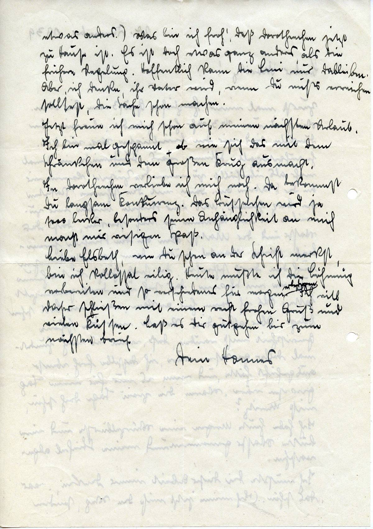 Liebe Elsbeth, wie Du schon an der Schrift merkst, bin ich kolossal eilig. Heute mußte ich die Löhnung vorbereiten und so verschiedenes für morgen erledigen. Ich will daher schließen mit einem recht frohen Gruß und vielen Küssen. Laß es dir gut gehen bis zum nächsten Brief