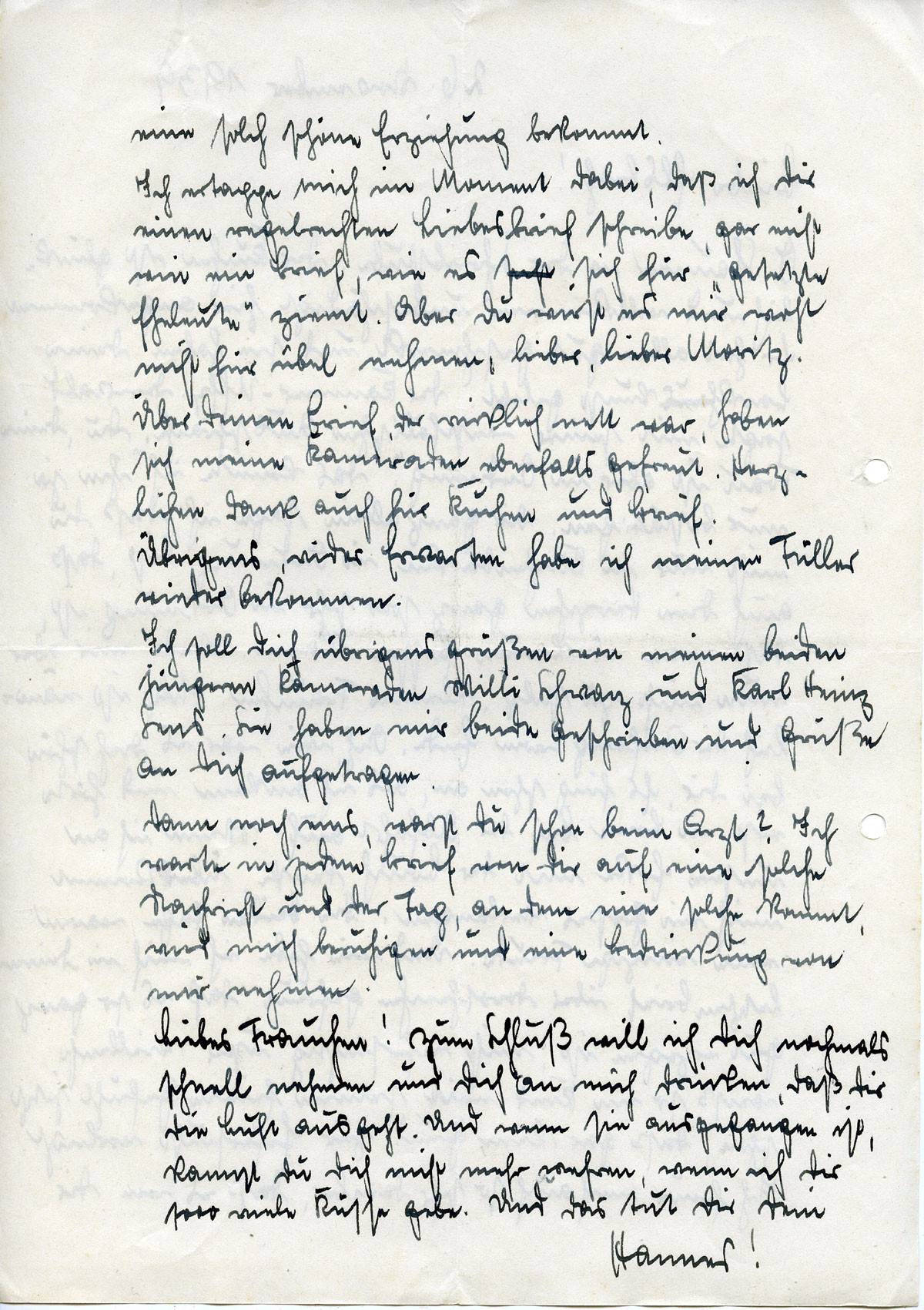 Ich soll Dich übrigens grüßen von meinen beiden jüngeren Kameraden, Willi Schwarz und Karl Heinz Sens. Sie haben mir beide geschrieben und Grüße an Dich aufgetragen.