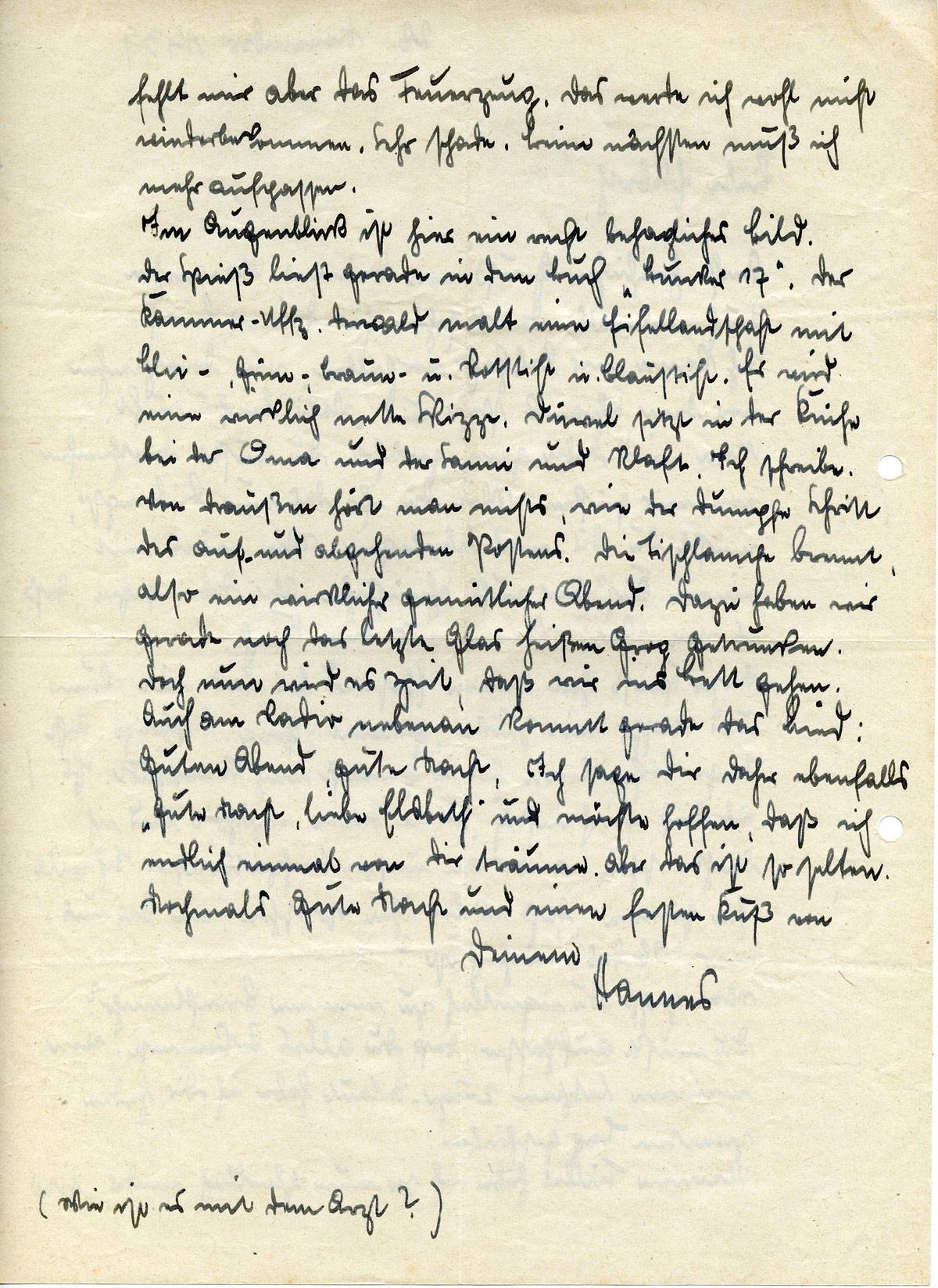 Recht herzlichen Gruß von Deinem Mannchen. Auch vielmals Dankeschön für Deinen Brief. Ich kann mir lebhaft vorstellen, wie Dorotheechen vor dem Schrank steht und „Vati Bief" ruft. Man wird dabei ganz gerührt. Du mußt Dorotheechen von mir grüßen. Wie Du ihr das nun beibringst, mußt Du Dir mal überlegen, Wie wärs mit einem Küßchen aufs Schnüßchen. Aber dabei sagen, daß es von Vati kommt aus dem Kiech.