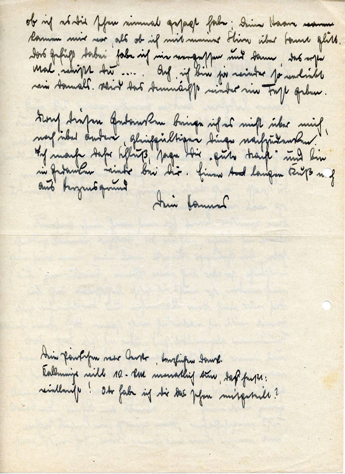 Nach diesen Gedanken bringe ich es nicht über mich, noch über andere, gleichgültige Dinge nachzudenken. Ich mache daher Schluß, sage Dir „gute Nacht" und bin in Gedanken wieder bei Dir. Einen langen Kuß noch aus Herzensgrund