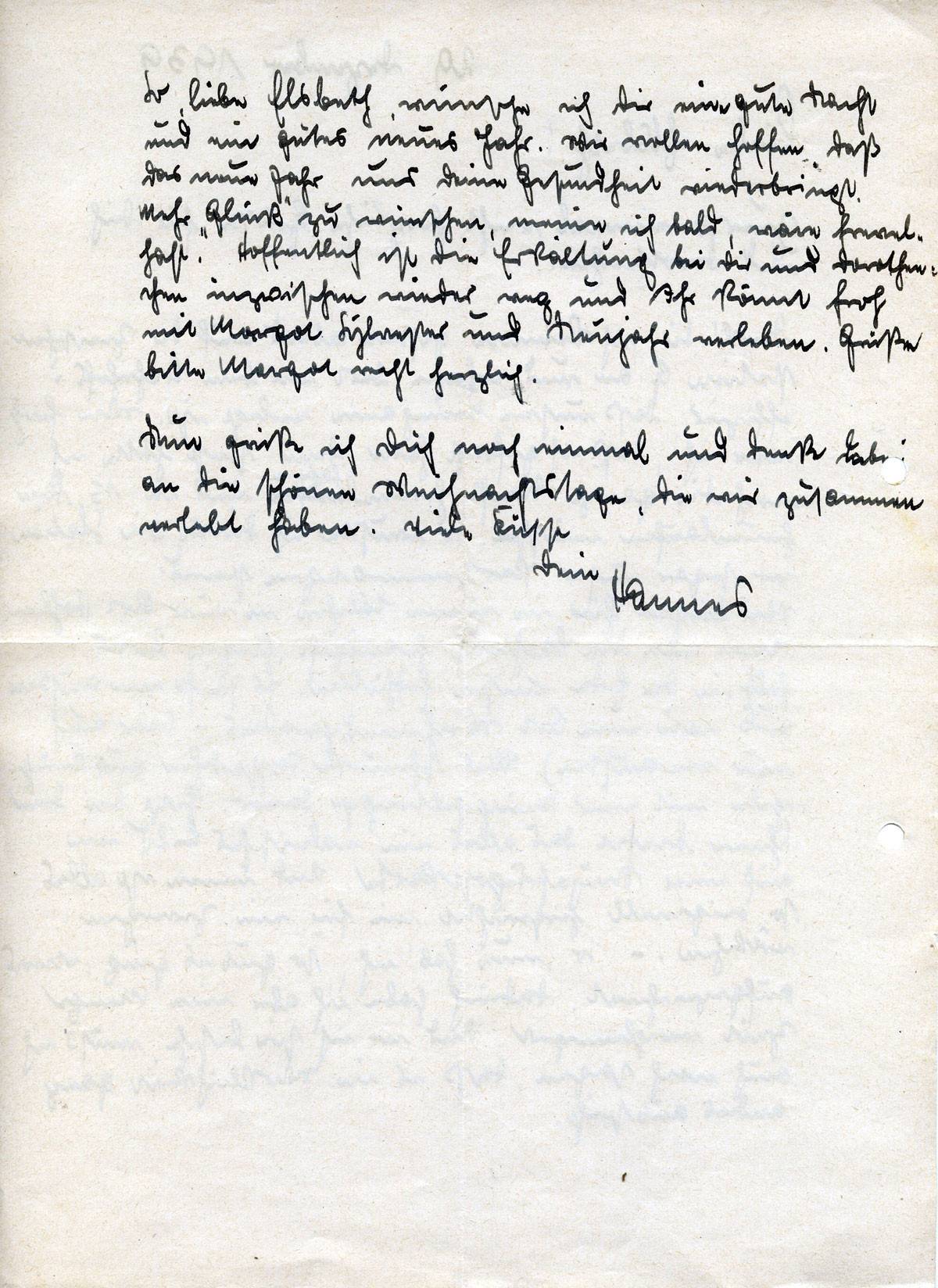 So, liebe Elsbeth, wünsche ich Dir eine gute Nacht und ein gutes neues Jahr. Wir wollen hoffen, daß das neue Jahr uns Deine Gesundheit wiederbringt. Mehr „Glück" zu wünschen, meine ich bald, wäre frevelhaft. Hoffentlich ist die Erkältung bei Dir und Dorotheechen inzwischen wieder weg und Ihr könnt froh mit Margot Sylvester und Neujahr verleben. Grüße bitte Margot recht herzlich.