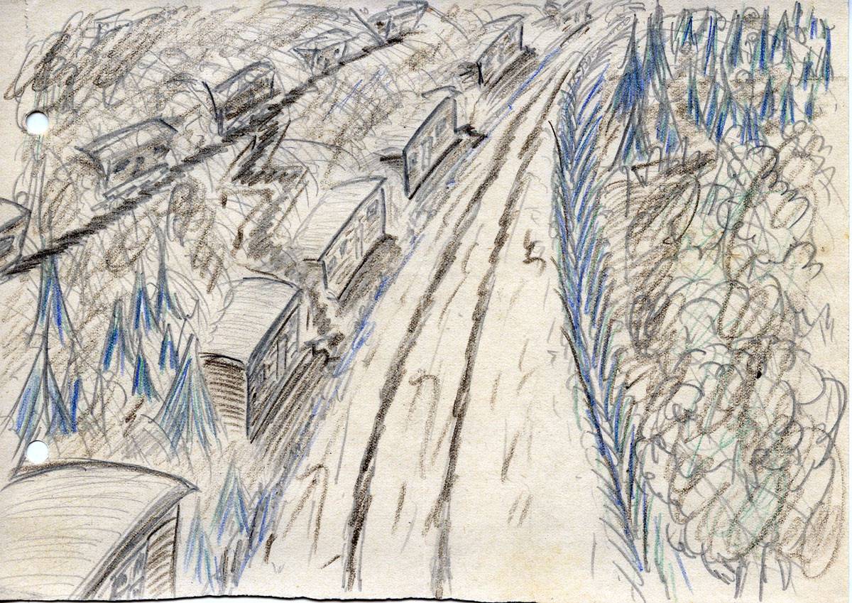 Wir liegen hier in einem Tälchen in einer Art Hohlweg. Wenn man den Bachlauf heraufgeht, liegen links halb in der Erde unsere Erdhütten. Es sieht von außen aus, wie eine Art Wochenendparadies — (aber auch nur von außen). Alles schmucke Fassädchen aus Knüppeln mit einer Knüppeltreppe davor. Jetzt bei dem Schnee bietet das alles ein malerisches Bild wie auf einer Neujahrspostkarte. Und immer ist alles so originell hergerichtet wie für ein Zwergenvölkchen. — So, nun hab' ich, so gut es ging, etwas aufgezeichnet. Dadurch habe ich aber eine Menge Zeit verplempert. Und wo ich sie besehe, muß ich auch noch sagen, daß es in Wirklichkeit ganz anders aussieht.