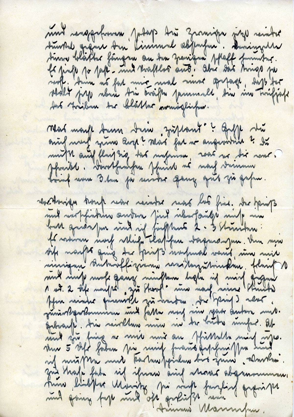 Vorvorige Nacht war wieder was los hier. Der Spieß und verschiedene andere sind überhaupt nicht im Bett gewesen und ich höchstens 2 - 3 Stunden. Es waren noch etliche Flaschen dagewesen. Um ein Uhr nachts ging der Spieß nochmal raus, um mit einigen Unteroffizieren weiterzutrinken. Erleichtert und nicht mehr ganz nüchtern legte ich mich gegen 1 od. 2 Uhr nachts „zu Stroh" um nach einer Stunde schon wieder geweckt zu werden. Der Spieß war zurückgekommen und hatte noch ein paar andere mitgebracht. Die wirkten nun in der Bude umher. Ab und zu fing er mit mir an schüttelte mich usw. Um 5 Uhr haben sie mich herausgeschmissen und ich mußte mit Kartenspielen bis zum „Wecken". Zur Strafe habe ich ihnen auch etwas abgenommen.