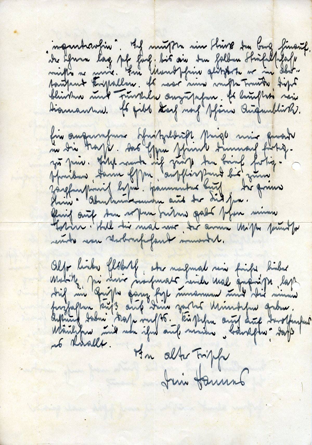 Also, liebe Elsbeth, oder nochmal wie früher lieber Moritz, sei mir nochmals viele Male gegrüßt, laß Dich im Geiste ganz fest umarmen und Dir einen herzhaften Kuß auf Dein zartes Mündchen geben. Achtung dabei Nase rechts. Küßchen auch auf Dorotheechens Mäulchen und von ihm auf meine „Bäckchen", daß es knallt.