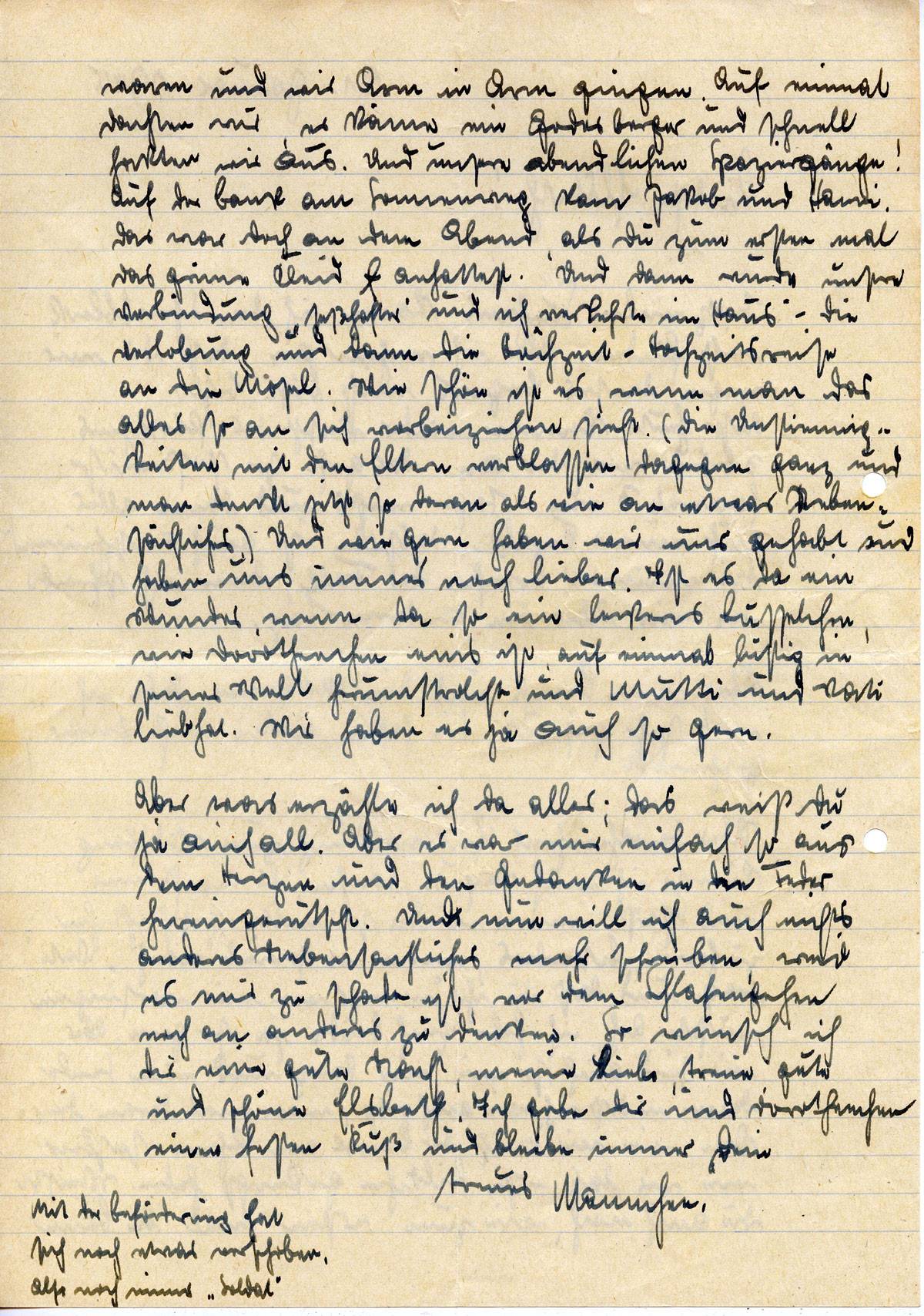 Aber was erzähle ich da alles; das weißt Du ja auch alles. Aber es war mir einfach so aus dem Herzen und den Gedanken in die Feder hereingerutscht. Und nun will ich auch nichts anderes Nebensächliches mehr schreiben, weil es mir zu schade ist, vor dem Schlafengehen noch an anderes zu denken. So wünsch' ich Dir eine gute Nacht, meine liebe, treue, gute und schöne Elsbeth. Ich gebe Dir und Dorotheechen einen festen Kuß und bleibe immer Dein