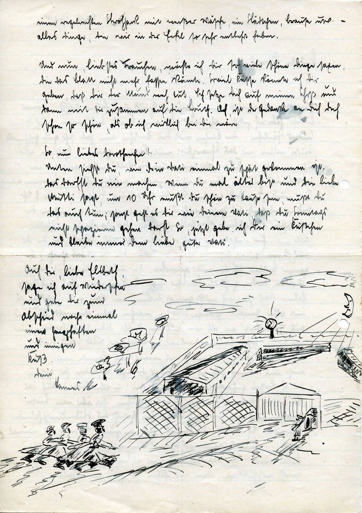 Zuvor mal wieder einen herzlichen Gruß und festen Kuß. Deine Briefe habe ich jetzt mal wieder auf einen Knall bekommen, auch Deine beiden Päckchen. Der Kuchen mit den Kirschen drin hat sehr gut geschmeckt. Heute wollen wir das Schwarzbrot mit Käse „angreifen“. Gestern war ich einmal im Kino. „Wir tanzen um die Welt“ wurde gespielt, ein mittelmäßiger Film. Aber es war einmal eine Abwechslung. In einem andern Kino wurde „Opernball“ gegeben. Aber die Vorstellung begann erst um 8 Uhr. Und in Anbetracht des Zapfenwichsens wollten Mergen und ich nicht in die erst später auslaufende Vorstellung gehen. Aber, so oder so, auffallen tut man hier - egal wie. Heute morgen hat Uffz. Bostel (der, den Du auch kennengelernt hast, der mit der Frau, die Dir etwas gleicht) unsere ganzen Betten durcheinander geworfen. Die müssen so gebaut werden, als ob die Decken gehobelte Bretter seien. Und wir vom Stab und Troß haben das ja noch nicht gezeigt bekommen. Man will jetzt scheints mit aller Gewalt zackige Soldaten machen. Dabei kommts anscheinend weniger auf „Tapferkeit“ an, als auf den Drill. Dabei schaut der Hermann von seiner Höhe (Hermannsdenkmal am Teutoburger Wald) und denkt: Also so wird das heute gemacht, zu meiner Zeit kannte man das nicht und dennoch habe ich die Römer besiegt. Außerdem hat gestern der Tf. Bostel gefragt, ob alles sauber sei (in allen Buden.) Auf das „Ja“ ist er dann auf einen Schemel gestiegen, hat über eine Leiste gefahren und den dreckigen Finger am Gesicht des Stubendiensthabenden abgeputzt. Ich warte nur darauf, daß ein junger Tf. mir das einmal macht!!! Einen Zusammenstoß mit einem solchen habe ich schon hinter mir. Aber, das kann einen alten Eifelaner ja alles nicht erschüttern. Denn wir haben ja jetzt eine saubere Stube,