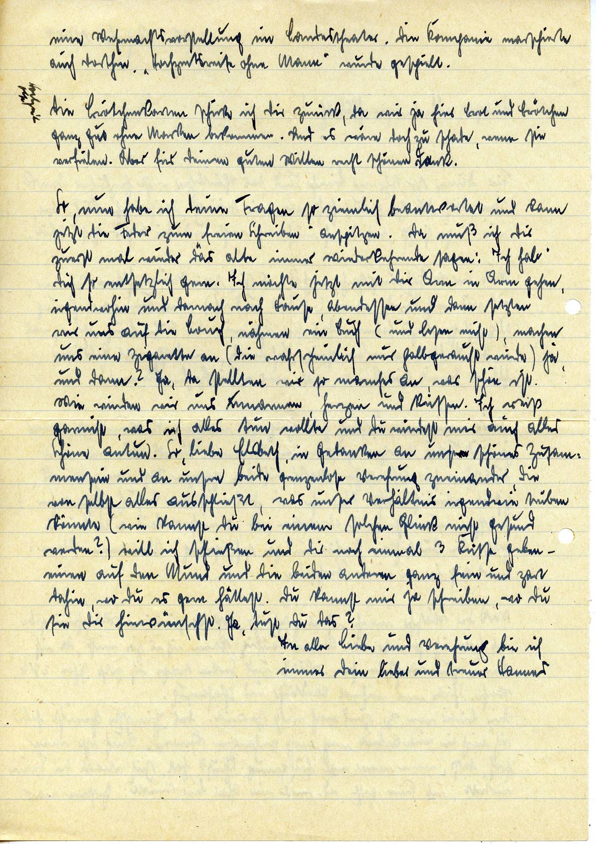 So, nun habe ich Deine Fragen so ziemlich beantwortet und kann jetzt die Feder zum „freien Schreiben“ anspitzen. Da muß ich Dir zuerst mal wieder das alte immer Wiederkehrende sagen: Ich hab Dich so entsetzlich gern. Ich möchte jetzt mit Dir Arm in Arm gehen, irgendwohin und danach nach Hause, Abendessen und dann setzten wir uns auf die Couch, nähmen ein Buch (und lesen nicht), machen uns eine Zigarette an (die wahrscheinlich nur halbgeraucht würde), ja, und dann? Ja, da stellten wir so manches an, was schön ist. Wie würden wir uns umarmen, herzen und küssen. Ich weiß garnicht, was ich alles tun wollte und Du würdest mir auch alles Schöne antun. So, liebe Elsbeth, in Gedanken an unser schönes Zusammensein und an unser beider grenzenlose Verehrung zueinander, die von selbst alles ausschließt, was unser Verhältnis irgendwie trüben könnte (wie kannst Du bei einem solchen Glück nicht gesund werden?) will ich schließen und Dir noch einmal 3 Küsse geben — einen auf den Mund und die beiden anderen ganz fein und zart dahin, wo Du es gern hättest. Du kannst mir ja schreiben, wo Du sie Dir hinwünschst. Ja, tust Du das?