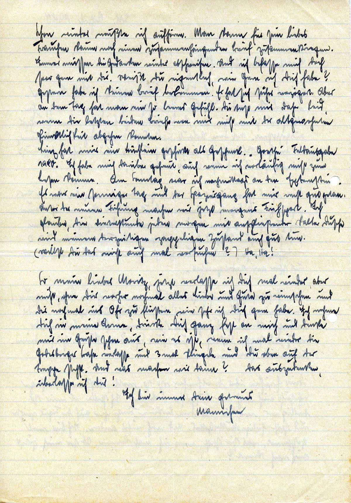 Schon wieder mußte ich aufhören. Man kann für sein liebes Frauchen kaum noch einen zusammenhängenden Brief zusammenkriegen. Immer müssen die Gedanken wieder abschweifen. Und ich befasse mich doch sooo gern mit Dir. Weißt Du eigentlich, wie gern ich Dich habe? Gestern habe ich keinen Brief bekommen. Er hat sich sicher verzögert. Aber an dem Tag hat man ein so leeres Gefühl. Du tust mir daher leid, wenn die letzten beiden Briefe von mir nicht mit der altgewohnten Pünktlichkeit abgehen konnten.