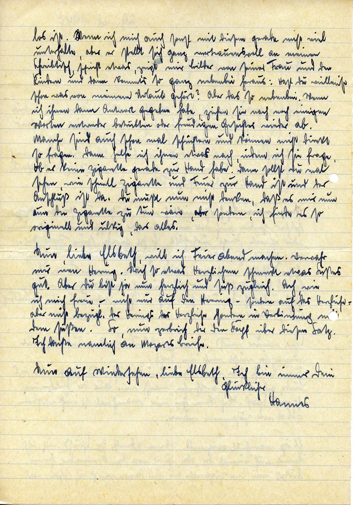 Nun liebe Elsbeth, will ich Feierabend machen. Verwahr mir 'nen Hering. Nach so etwas Herzlichem schmeckt etwas Süßes gut. Aber Du bist ja nun herzlich und süß zugleich. Ach, wie ich mich freue — nicht nur auf den Hering — sondern auf das Herzliche — aber nicht bezügl. des Herings das Herzliche sondern in Verbindung mit dem Süßen. So, nun zerbrich Dir den Kopf über diesen Satz.