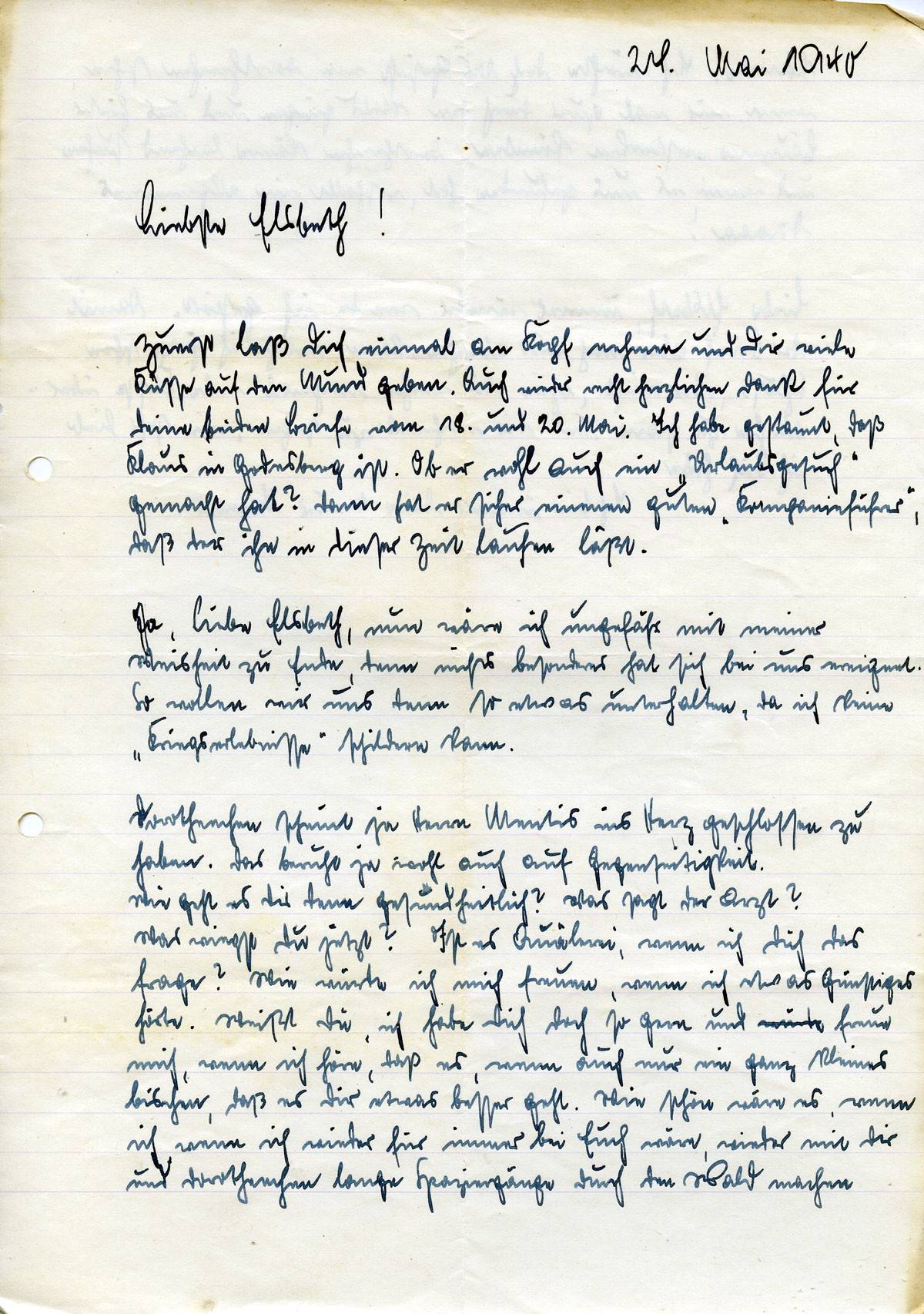 Zuerst laß Dich einmal am Kopf nehmen und Dir viele Küsse auf den Mund geben. Auch wieder recht herzlichen Dank für Deine beiden Briefe vom 18. und 20. Mai. Ich habe gestaunt, daß Klaus [Hannes' Bruder] in Godesberg ist. Ob er wohl auch ein „Urlaubsgesuch“ gemacht hat? Dann hat er sicher einen guten „Kompanieführer“, daß der ihn in dieser Zeit laufen läßt.