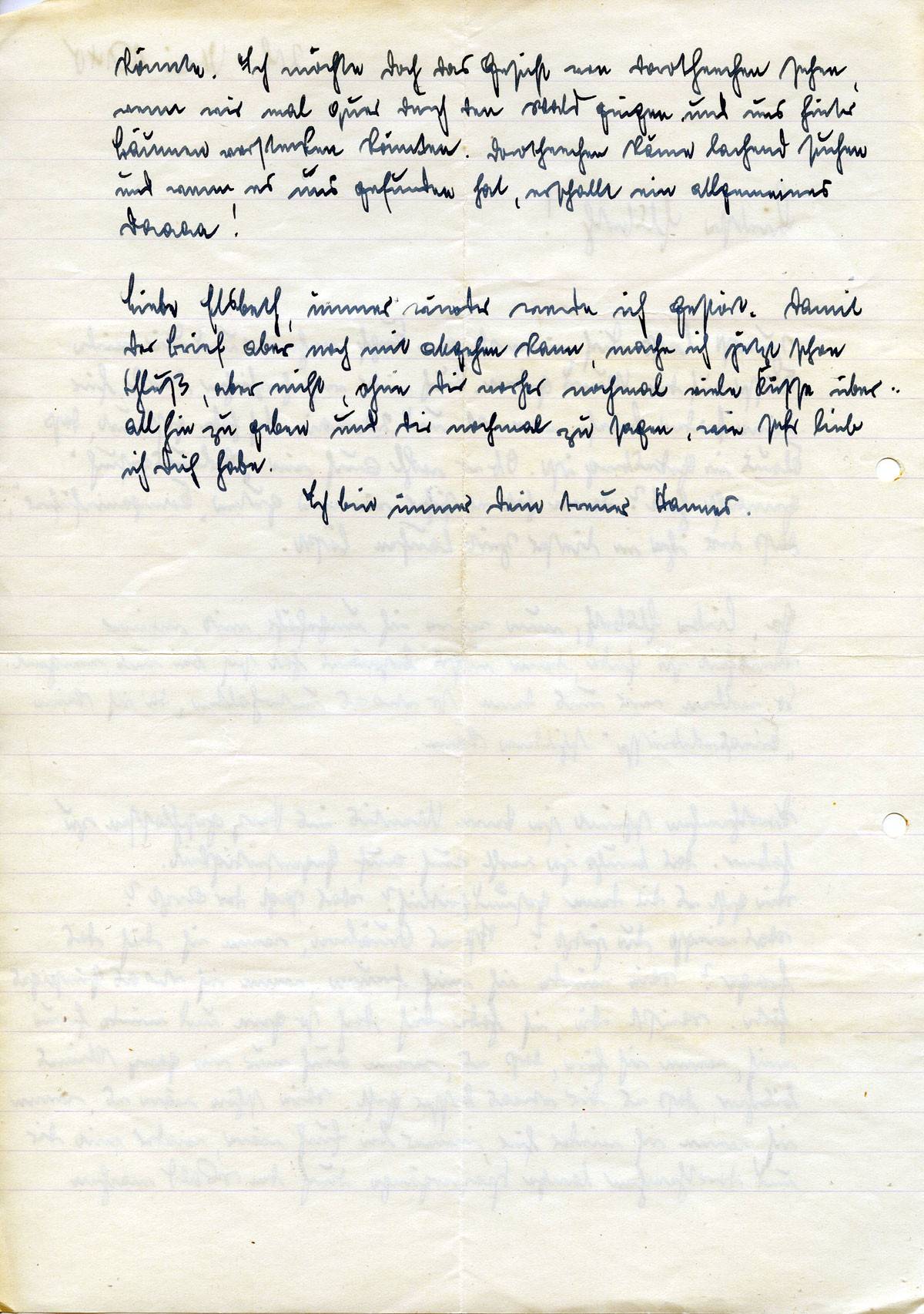 Liebe Elsbeth, immer wieder werde ich gestört. Damit der Brief aber noch mit abgehen kann, mache ich jetzt schon Schluß, aber nicht, ohne Dir vorher nochmal viele Küsse überallhin zu geben und Dir nochmal zu sagen, wie sehr lieb ich Dich habe.