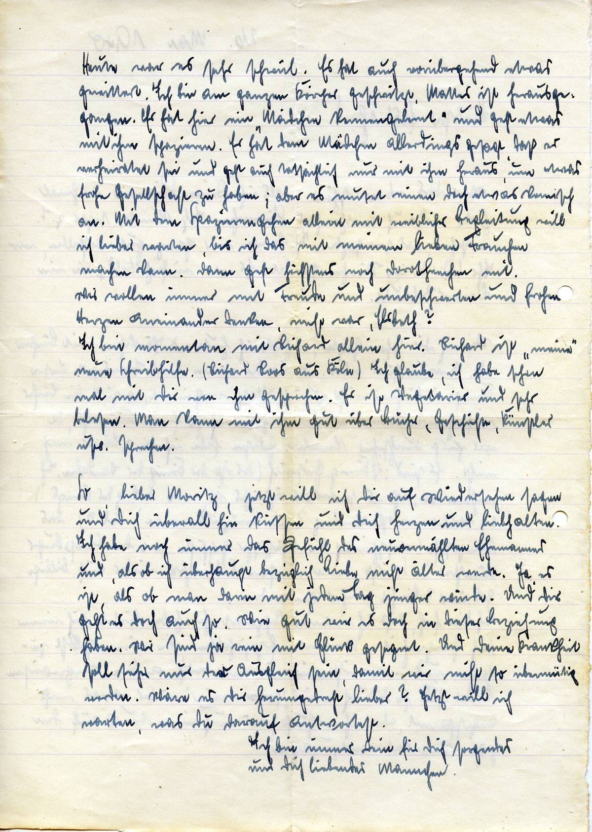 So, lieber Moritz, jetzt will ich Dir auf Wiedersehen sagen und Dich überall hin küssen und Dich herzen und liebhalten. Ich habe noch immer das Gefühl des neuvermählten Ehemannes und, als ob ich überhaupt bezüglich Liebe nicht älter werde. Ja, es ist, als ob man darin mit jedem Tag jünger würde. Und Dir geht es doch auch so. Wie gut wir es doch in dieser Beziehung haben. Wir sind ja rein mit Glück gesegnet. Und Deine Krankheit soll sicher nur der Ausgleich sein, damit wir nicht so übermütig werden. Wäre es Dir herumgedreht lieber? Jetzt will ich warten, was Du darauf antwortest.