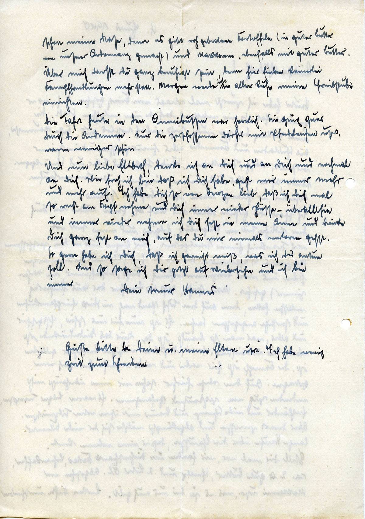 Und nun liebe Elsbeth, denke ich an Dich und an Dich und nochmal an Dich. Wie froh ich bin, daß ich Dich habe, geht mir immer mehr und mehr auf. Ich habe dich so von Herzen lieb, daß ich dich mal so recht am Kopf nehme und Dich immer wieder küsse — überall hin und immer wieder nehme ich Dich fest in meine Arme und drücke Dich ganz fest an mich, auf das Du mir niemals verloren gehst. So gern habe ich Dich, daß ich gar nicht weiß, was ich Dir antun soll. Und so sage ich Dir jetzt auf Wiedersehen und ich bin immer Dein treuer