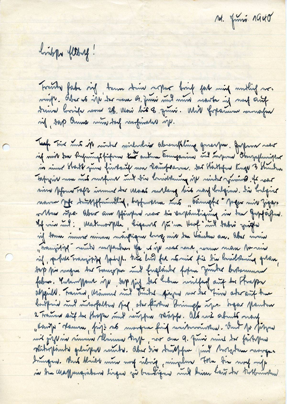 Freude habe ich, denn Dein erster Brief hat mich endlich erreicht. Aber es ist der vom 9. Juni und nun warte ich noch auf Deine Briefe vom 28. Mai bis 8. Juni. Mit Erstaunen vernahm ich, daß Anna nun doch verheiratet ist.