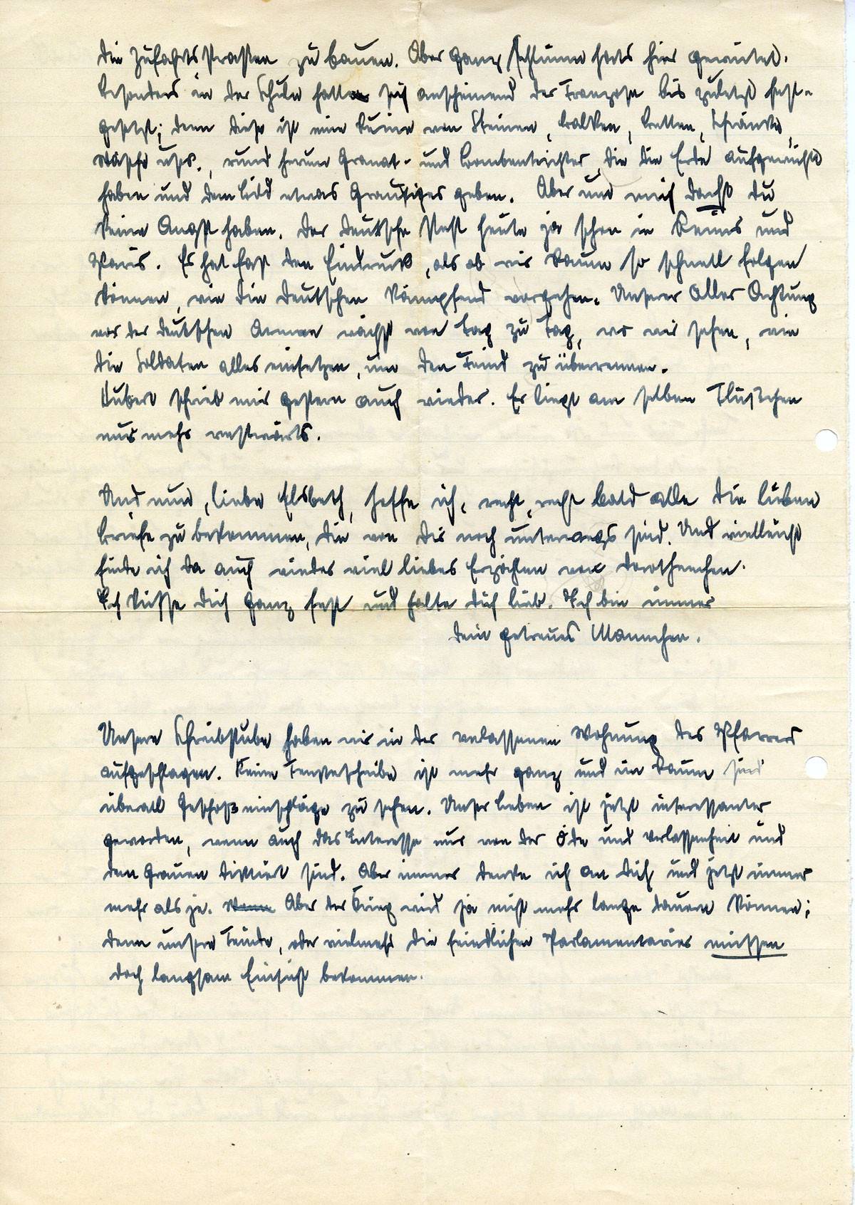 Unsere Schreibstube haben wir in der verlassenen Wohnung des Pfarrers aufgeschlagen. Keine Fensterscheibe ist mehr ganz und im Raum sind überall Geschoßeinschläge zu sehen. Unser Leben ist jetzt interessanter geworden, wenn auch das Interesse nur von der Öde und Verlassenheit und den Grauen diktiert sind. Aber immer denke ich an Dich und jetzt immer mehr als je. Wenn Aber der Krieg wird ja nicht mehr lange dauern können; denn unsere Feinde, oder vielmehr die feindlichen Parlamentarier müssen doch langsam Einsicht bekommen.