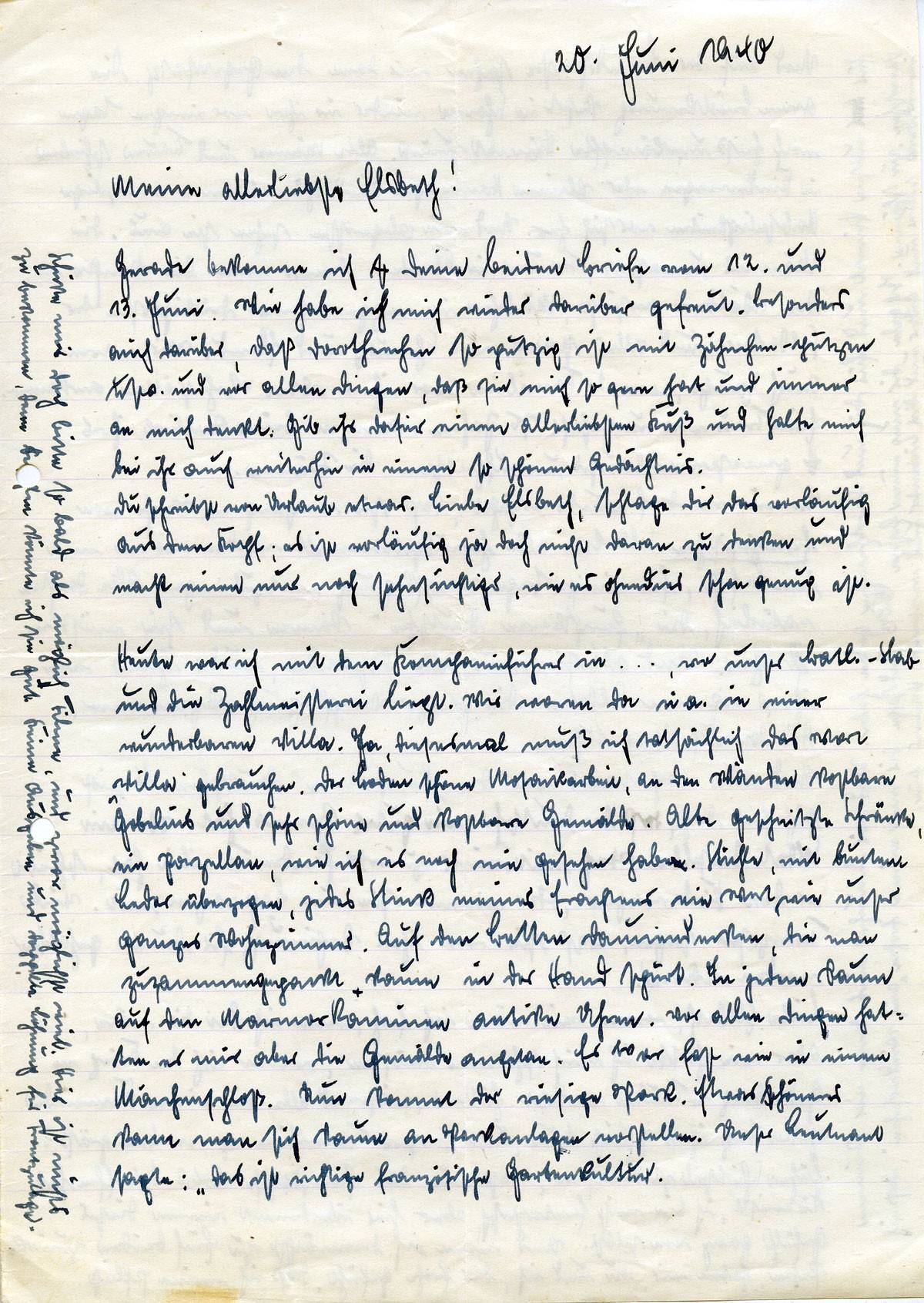 Liebe Elsbeth, wenn wie wäre ich froh, wenn ich bei Dir wäre, aber wie hätte ich mich schämen müssen, wenn ich den Krieg in Godesberg in Freuden verlebt hätte, während alle die vielen Kameraden jeden Tag ihre Pflicht tun, um unsere Familien vor dem gräßlichen Schicksal zu bewahren, daß nun das französische Volk betroffen hat. Du weißt, ich bin nicht fantastisch, aber hier überkommt einen dieses Gefühl ganz von selbst. Und wenn ich demnächst zu Euch beiden zurückkehre, haben wir, Du und ich, das frohe Gefühl, daß ich meine Pflicht