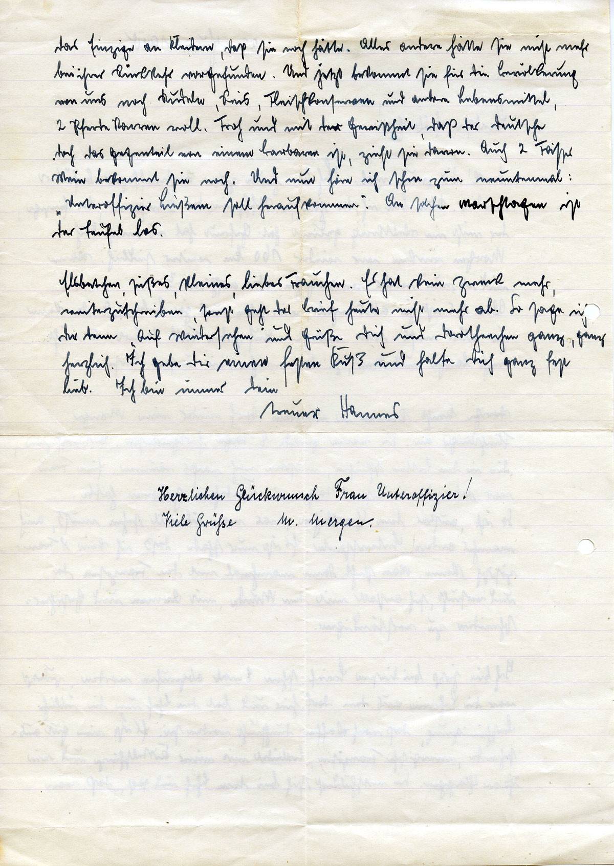 Denk' Dir nur mal. Ich bin heute zum Unteroffizier befördert worden. Nun bin ich der jüngste Uffz. in der Kompanie, der einzige, der nicht im Weltkrieg gedient hat. Gefreut hat es mich doch. Morgen rücken wir wieder 160 km weiter südlich. Wann wird es nun wieder weitergehen oder aufhören? -