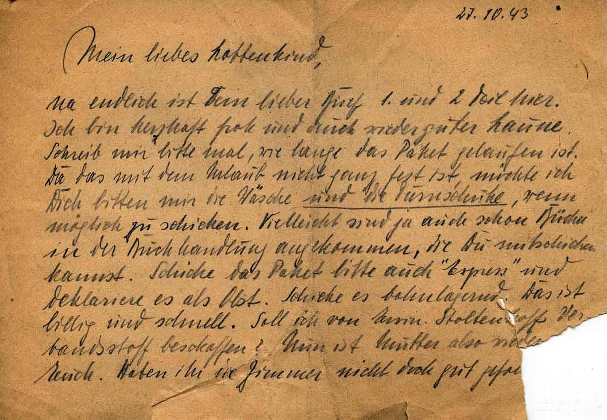 Na endlich ist Dein lieber Brief 1. und 2. Teil hier. Ich bin herzhaft froh und auch wieder guter Laune. Schreibt mir bitte mal, wie lange das Paket gelaufen ist. Da das mit dem Urlaub nicht ganz fest ist, möchte ich Dich bitten mir die Wäsche und die Turnschuhe, wenn möglich zu schicken. Vielleicht sind ja auch schon Bücher in der Buchhandlung angekommen, die Du mit schicken kannst. Schicke das Paket bitte auch“ Express“ und deklariere es als Obst. Schicke es bahnlagernd. Das ist billig und schnell. Soll ich von Erwin Stoltenhoff Verbandsstoff beschaffen? Nun ist Mutter also wieder bei euch. Haben wir die Zimmer nicht doch gut gefallen, wie