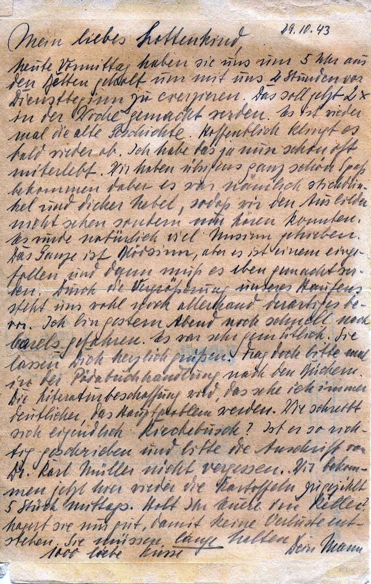 Heute Vormittag haben sie uns um 5 Uhr aus den Betten geholt um mit uns 2 Stunden vor Dienstbeginn zu exerzieren. Das soll jetzt 2 x in der Woche gemacht werden. Es ist wieder mal die alte Geschichte. Hoffentlich klingt es bald wieder ab. Ich habe das ja nun schon oft miterlebt. Wir haben übrigens ganz schön Spaß bekommen dabei – es war nämlich stichdunkel und dicker Nebel, so dass wir den Ausbilder nicht sehen sondern nur hören konnten. Es wurde natürlich viel Unsinn getrieben. Das ganze ist Blödsinn, aber es ist einem eingefallen und dann muss es eben gemacht werden. Durch die Vergrößerung unseres Haufens steht uns wohl noch allerhand derartiges bevor. Ich bin gestern Abend noch schnell nach Carels gefahren. Es war sehr gemütlich. Sie lassen Dich herzlich grüßen. Frag doch bitte mal in der Pädabuchhandlung nach den Büchern. Die Literaturbeschaffung wird, das sehe ich immer deutlicher, das Hauptproblem werden. Wie schreibt sich eigentlich Kieckebusch (= Dekan der Uni Bonn). Ist er so richtig geschrieben und bitte die Anschrift von Dr. Karl Mueller nicht vergessen. Wir bekommen jetzt hier wieder die Kartoffeln zugezählt. 5 Stück Mittags. Habt Ihr Euere im Keller? Lagert sie nur gut, damit keine Verluste entstehen. Sie müssen lange halten.