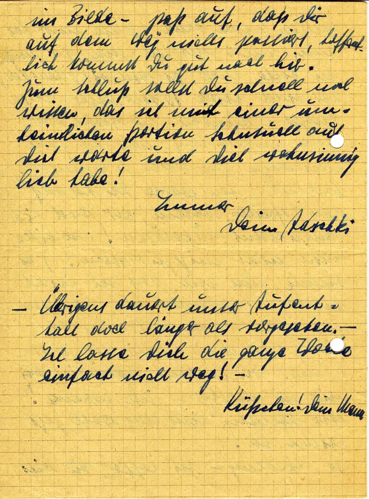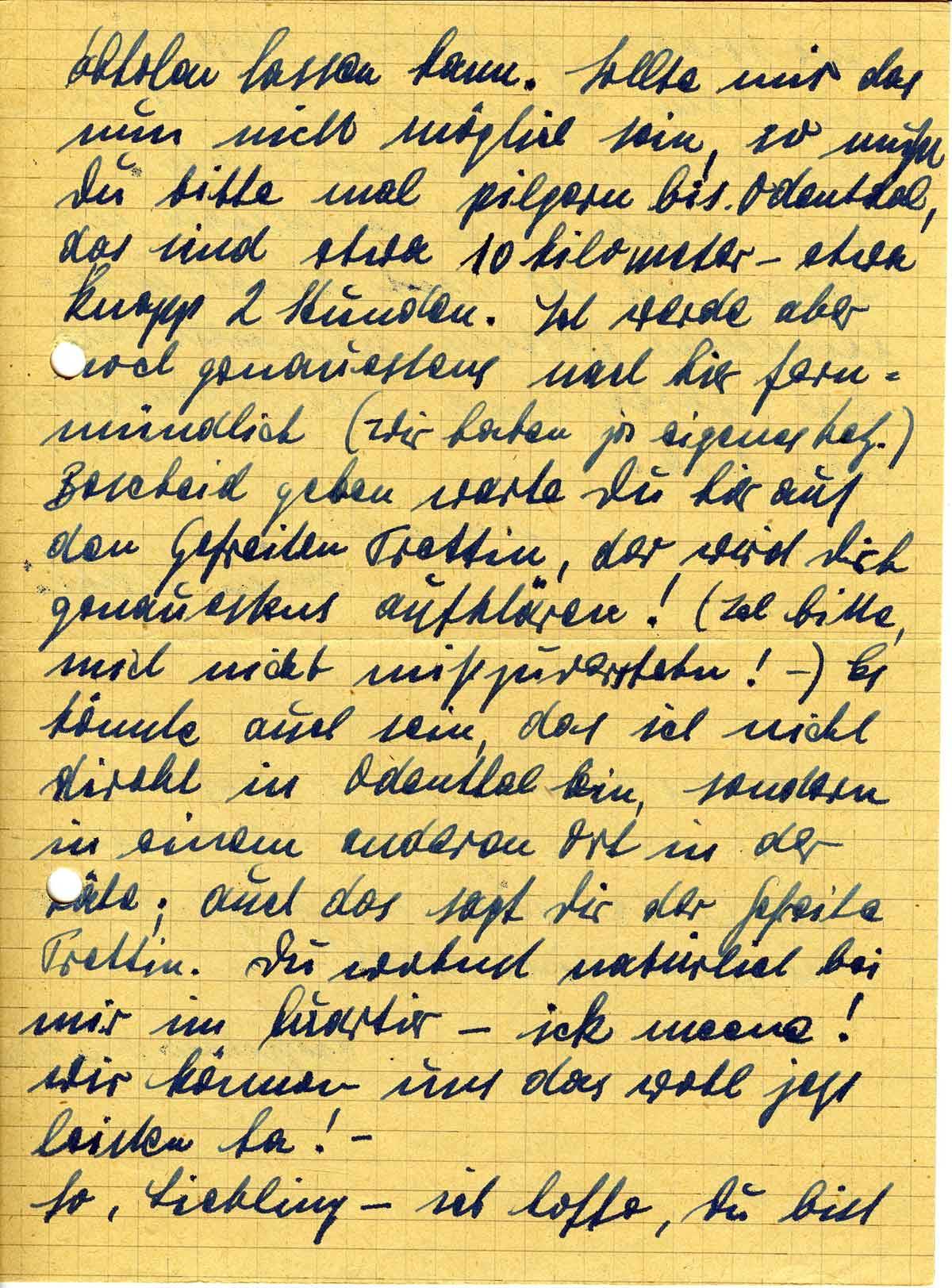 abholen lassen kann. Sollte mir das nun nicht möglich sein, so mußt Du bitte mal pilgern bis Odenthal, das sind etwa 10 Kilometer - etwa knapp 2 Stunden. Ich werde aber noch genauestens nach hier fernmündlich (wir haben ja eigenes Netz) Bescheid geben. Warte Du hier auf den Gefreiten Trettin, der wird Dich genauestens aufklären! (Ich bitte, mich nicht mißzuverstehen! -) Es könnte auch sein, das ich nicht direkt in Odenthal bin, sondern in einem anderen Ort in der Nähe; auch das sagt Dir der Gefreite Trettin. Du wohnst natürlich bei mir im Quartier - ick meene! wir können uns das wohl jetzt leisten ha! -