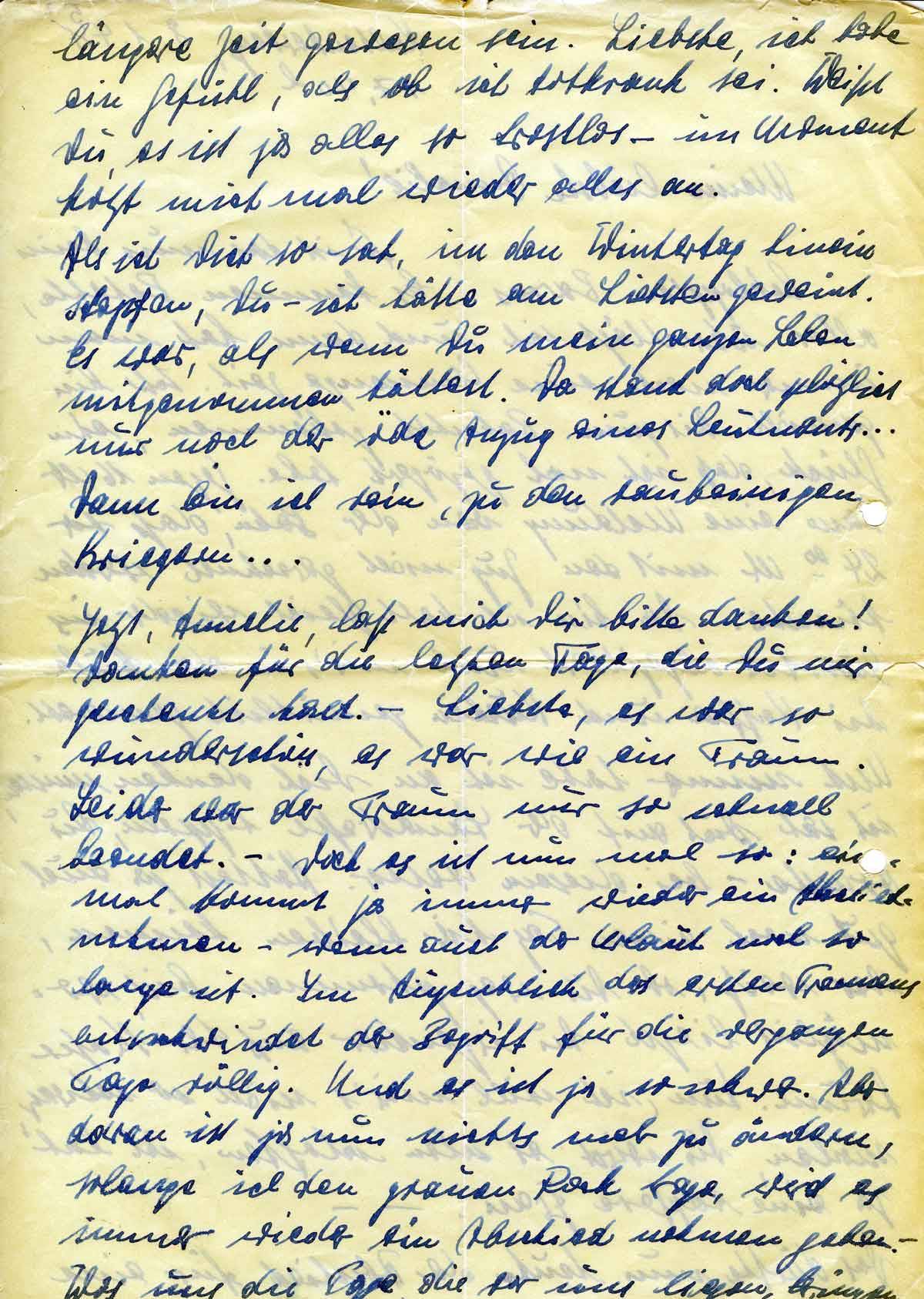 Annelie, ich liebe Dich - - liebe gute Frau. Und dann: Du hast doch noch den Brief, den ich Dir vor meinem ersten Fronteinsatz gab - Du weißt! - bitte vernichte ihn gleich durch Feuer. Ich habe nicht daran gedacht; jetzt wo wir verheiratet sind, ist er gegenstandslos geworden und ich möchte nicht, das Du ihn noch länger aufbewahrst. -